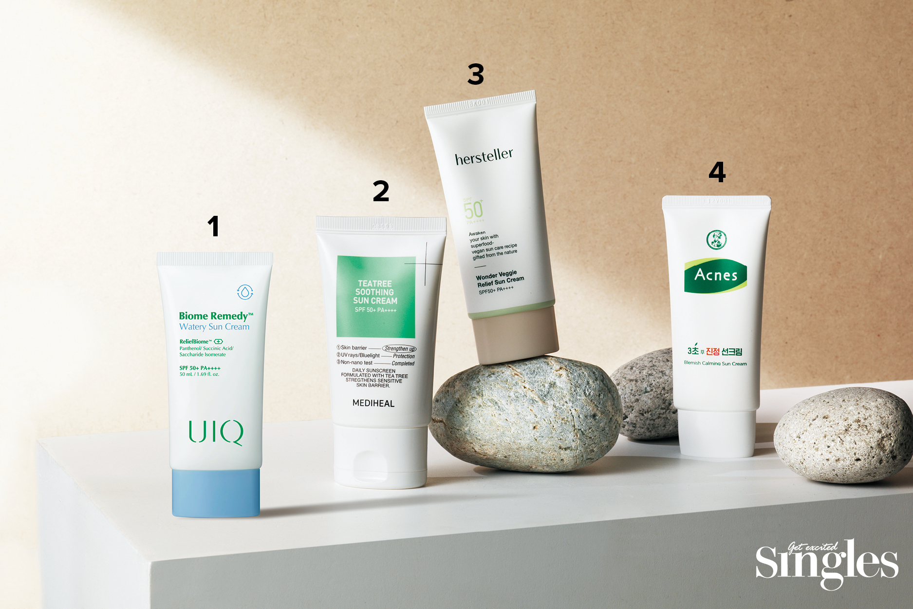 1 유이크바이옴 레미디 수분 선크림 SPF50+ PA++++ 마이크로바이옴 연구소에서 특수 발효 공법을 적용한 릴리프 바이옴™에 판테놀을 더해 피부 진정 효과를 극대화했다. 50ml 2만7000원. 2 메디힐 티트리 수딩 선크림 SPF 50+ PA++++ 티트리카밍바이옴™과 티트리잎수 오일, 티트리잎 오일의 주요 성분이 강력한 진정 효과를 선사한다. 논나노 입자로 자극 없이 블루라이트까지 차단. 50ml×2ea 2만5000 원. 3 허스텔러 원더 베지 릴리프 선크림 SPF 50+ PA++++ 건강한 베지 성분을 담아 자외선 차단은 물론 적외선으로 인한 피부 자극까지 순하게 다독인다. 50ml 2만6000원. 4 아크네스 3초 진정 선크림 SPF 50+ PA++++ 피부 진정에 탁월한 티트리잎 추출물, 병풀 추출물이 여드름성 피부 진정에 도움을 주고 보송하게 마무리된다. 50g 2만2000원.