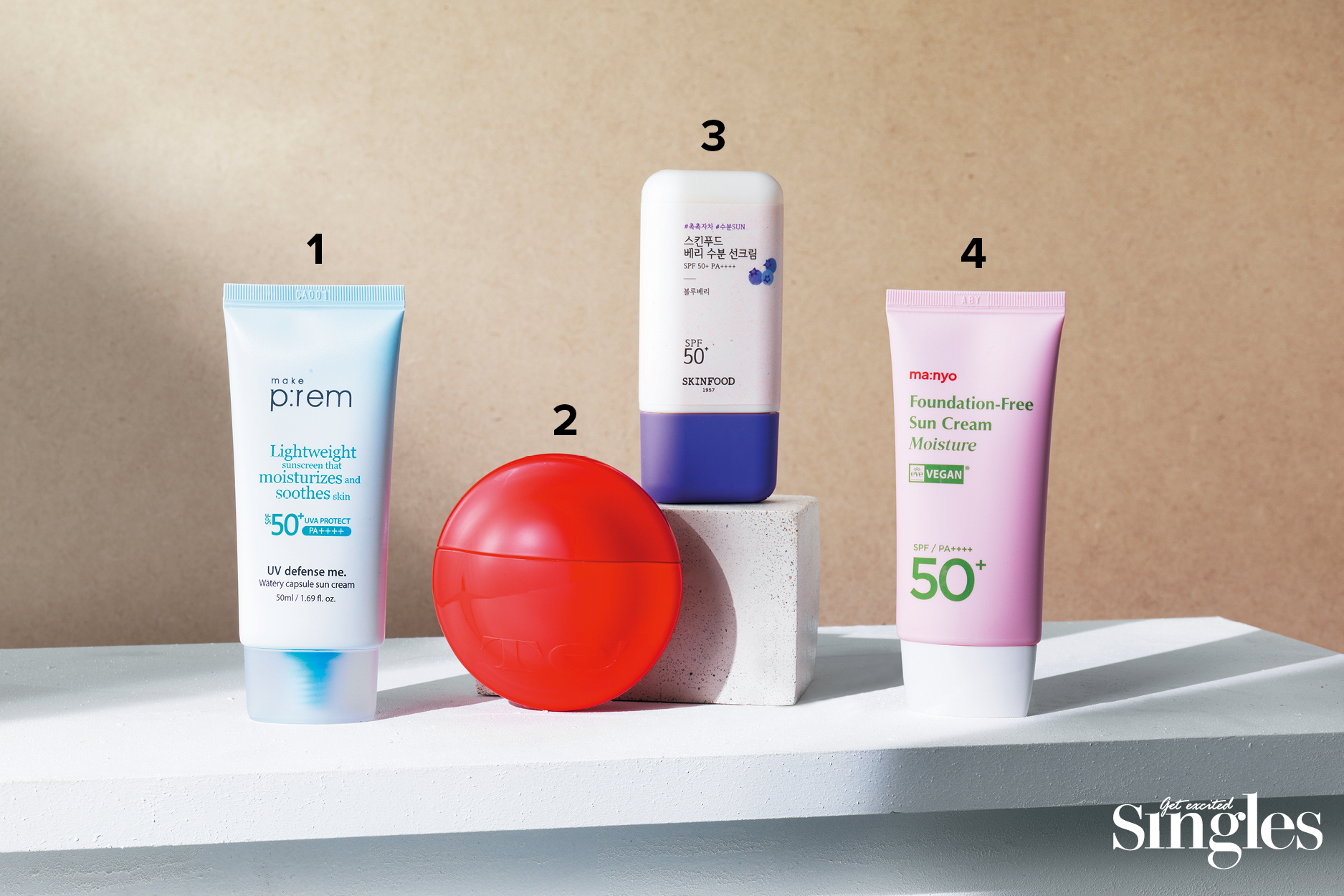 1 메이크프렘 유브이 디펜스 미 워터리 캡슐 선크림 SPF 50+ PA++++ 저분자 히알루론의 비건 수분 캡슐이 깊숙이 수분을 충전한다. 50ml 2만4000원. 2 테’ 빨강 50 SPF 50, PA++++ 피부 저자극 테스트를 완료한 스포츠용 선크림. 착 UVA 차단막으로 물에 지워지지 않는 강한 지속력을 자랑한다. 50g 3만2000원. 3 스킨푸드 베리 수분 선크림 SPF 50+ PA++++ 100% 사탕수수 유래 종이 및 친환경 콩기름 잉크를 적용한 수분 선 제품. 50ml 2만4000원. 4 마녀공장 파데프리 선크림 모이스처 SPF 50+ PA++++ 오션-프렌들리의 비건 선크림. 재활용 플라스틱 PCR 100% 튜브를 비롯한 착한 패키지를 갖추었다. 50ml 2만8000원.