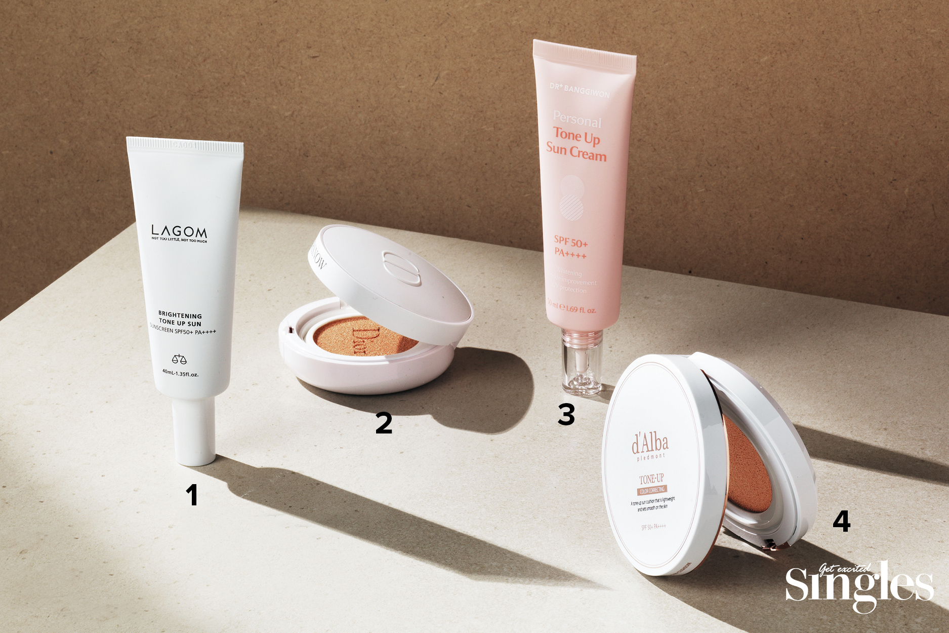 1 라곰 브라이트닝 톤업 선 SPF 50+ PA++++ 글루타티온, 3중 비타민 콤플렉스가 들어 있는 핑크빛 수분 포뮬러가 부드럽게 밀착한다. 40ml 3만6000원. 2 디올 뷰티 디올스노우 유브이 쉴드 쿠션 SPF 50+ PA+++ 피부를 화사하게 가꿔주는 비타민 C 유도체와 에델바이스 성분이 풍부하게 함유되어 결점 없이 빛나는 피부로 가꿔준다. 15g×2 11만2000원대. 3 닥터방기원 퍼스널 톤업 선크림 SPF 50+ PA++++ 베이지 베이스의 웜톤과 핑크 베이스의 쿨톤으로 퍼스널 컬러에 따라 사용이 가능하다. 50ml 2만2800원. 4 달바 워터풀 톤업 선 쿠션 SPF 50+ PA++++ 기능성 비건 톤업 선 제품으로 백탁 현상 없이 어떤 피부 톤에도 자연스럽게 어우러진다.
