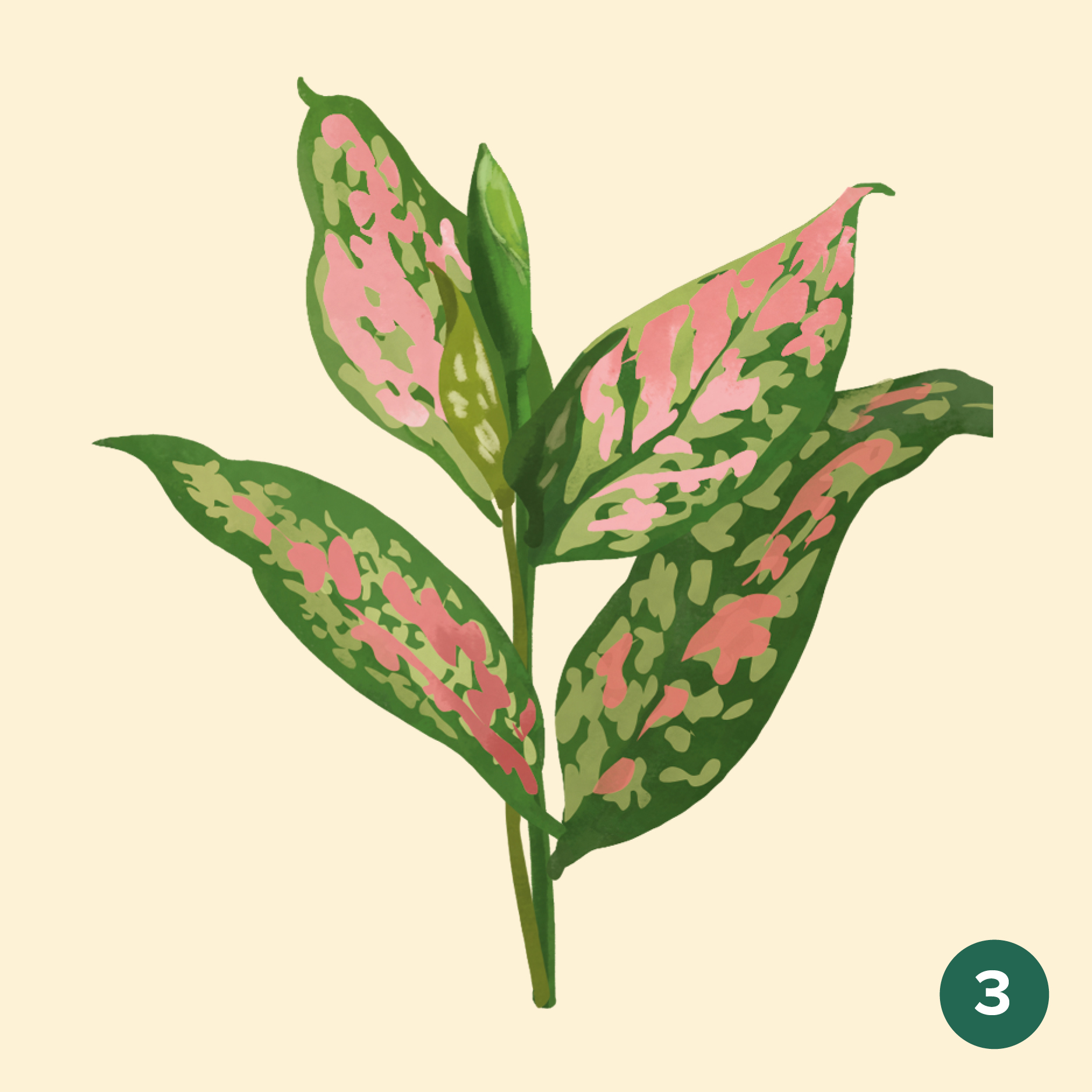 영화 <레옹>에 등장한 화분으로 유명한 아글라오네마. 아글라오네마는 녹색 잎에 흰색, 붉은색, 분홍색 반점 등 색상과 무늬가 다양한데 그중 핑크색 무늬가 있는 것을 ‘아글라오네마 엔젤’이라고 한다. 빛이 안 드는 실내에서도 잘 자라고 건조한 환경에 강해 흙이 말랐을 때만 물을 준다.
