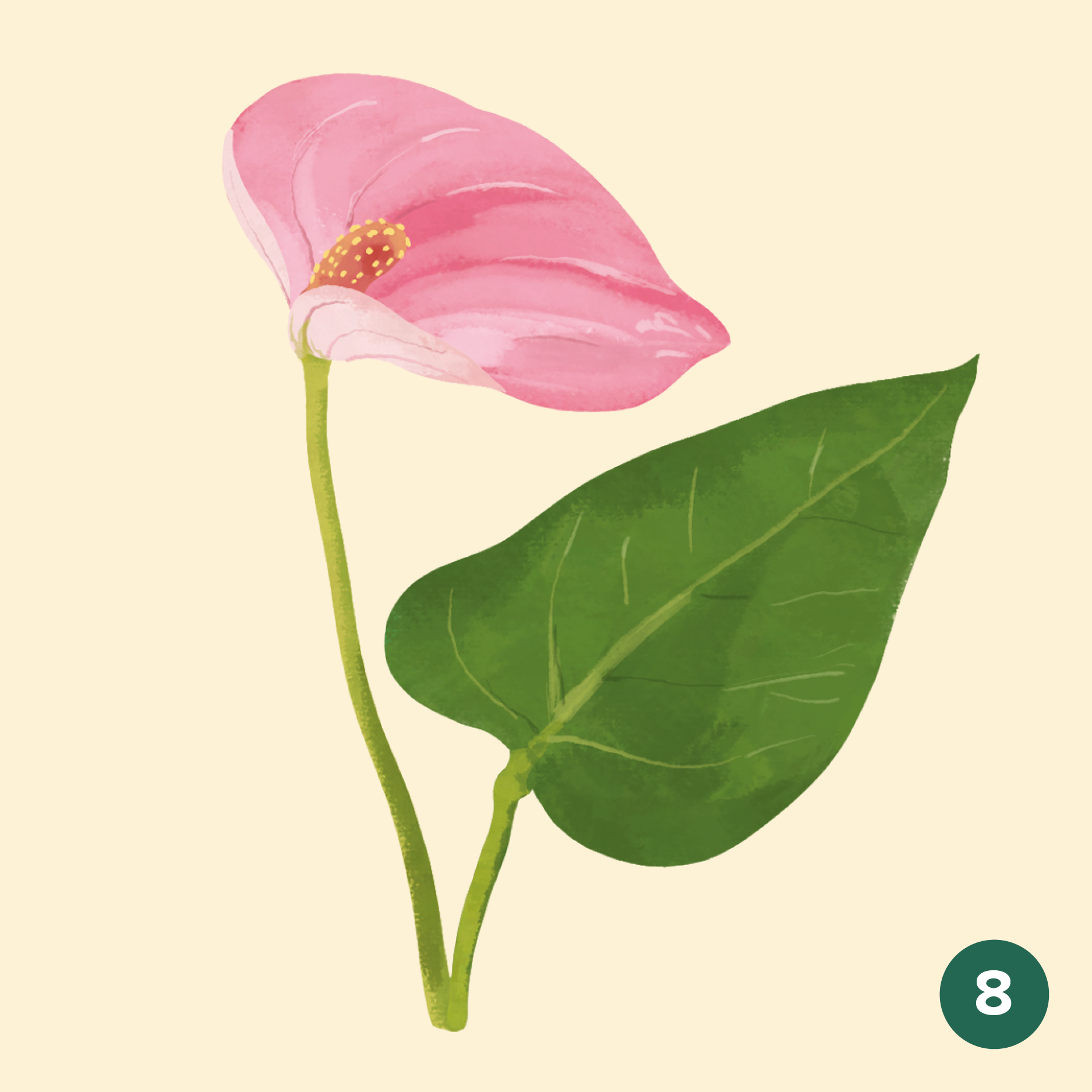 열대지방이 원산지로 홍학꽃이라고도 불린다. 수술처럼 생긴 육수화서를 둘러싼 넓은 잎 모양은 흰색, 빨간색, 산호색 등 다양하다. 물을 좋아하지만 물 주기가 매우 까다로운데 흙이 말랐을 때만 충분히 물을 주는 것이 좋다. 암모니아를 제거하고 음이온을 발생시키는 효과가 있다.