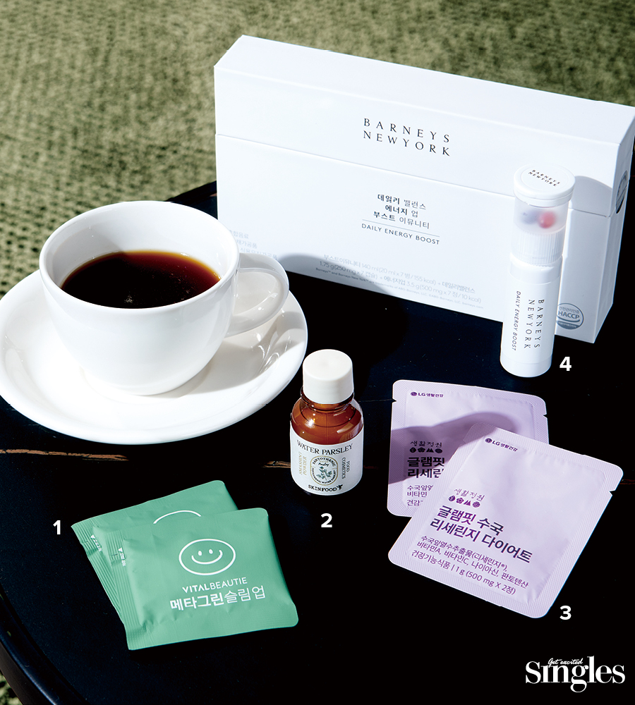1 바이탈뷰티 메타그린 슬림업 기름진 식사를 자주 하는 이들에게 추천. 체지방 감소, 콜레스테롤 개선에 도움을 주는 녹차 카테킨 300mg을 담았다. 30ea 3만6000원. 2 스킨푸드 판토테닉 워터 파슬리 스매싱 파우더 피부 유수분 밸런스를 위한 판토텐산과 미나리 추출물이 들어 있어 잘 가라앉지 않는 스폿을 잠재운다. 15ml 1만6000원. 3 생활건강 글램핏 수국 리세린지 다이어트 체지방 감소와 피부 수분을 끌어올리는 다이어트 신소재 수국잎열수 추출물을 함유했다. 42ea(6주분) 14만9000원. 4 바니스뉴욕 뷰티 데일리 밸런스 에너지업 부스트 이뮤니티 아연과 18가지 필수 비타민을 함유해 활력을 선사한다. 설탕, 착색료, 젤라틴, 향료, 인공 감미료를 배제한 프리미엄 믹스 오렌지의 건강한 맛을 느낄 수 있다. 7ea 3만8000원.
