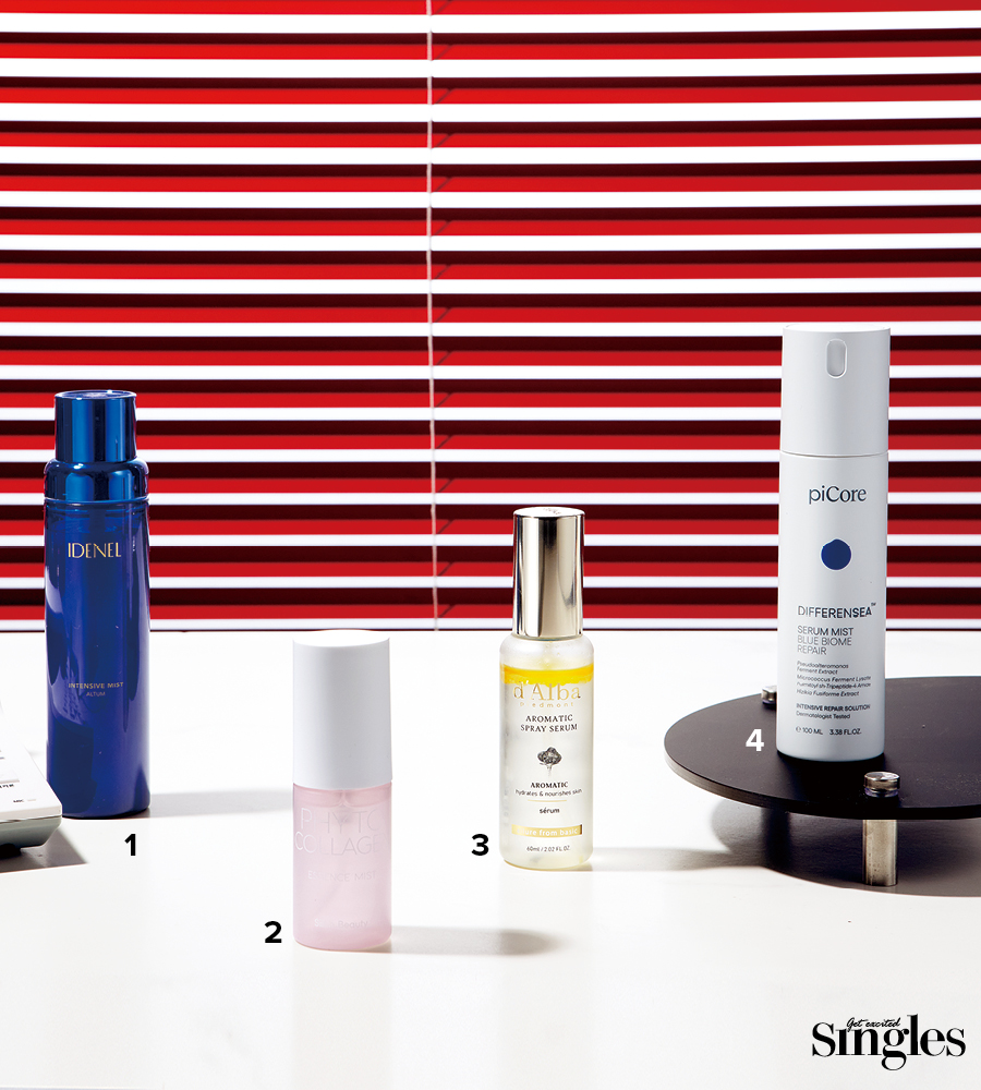 1 이데넬 인텐시브 미스트 초저분자 콜라겐 수가 77% 이상 함유되어 피부 사이사이 빈틈없이 촘촘하게 수분을 공급한다. 글루타치온 성분이 들어 있어 맑은 피부 톤으로 관리한다. 110ml 3만5000원. 2 실큰 뷰티 피토콜라겐 에센스 미스트 프로바이오틱스, 저분자 식물성 콜라겐 성분을 담은 에센스 포뮬러가 피부 보습과 영양을 보충한다. 시간이 지나도 날아가지 않는 짱짱한 보습감을 갖추었다. 30ml 1만5000원. 3 달바 화이트 트러플 퍼스트 아로마틱 스프레이 세럼 다마스크 장미 꽃수와 식물성 에너지로 뿌리는 순간 촉촉하고 탄력 있는 피부로 가꿔 준다. 달바-8 블렌딩 오일과 달바만의 독자적인 탄력 성분 트러페롤™ 이 풍부한 영양까지 더한다. 60ml 2만6000원. 4 파이코어 디퍼런씨 ™ 세럼 미스트 블루바이옴 리페어 세계에서 가장 깊은 마리아나 해구의 압력으로 농축된 86%의 마이크로바이옴 성분이 특징. 3중 세라마이드, 8중 히알루론산, 콜라겐, 해양식물 추출 배합액의 시너지가 깊고 진한 보습감을 부여한다. 100ml 3만5000원.