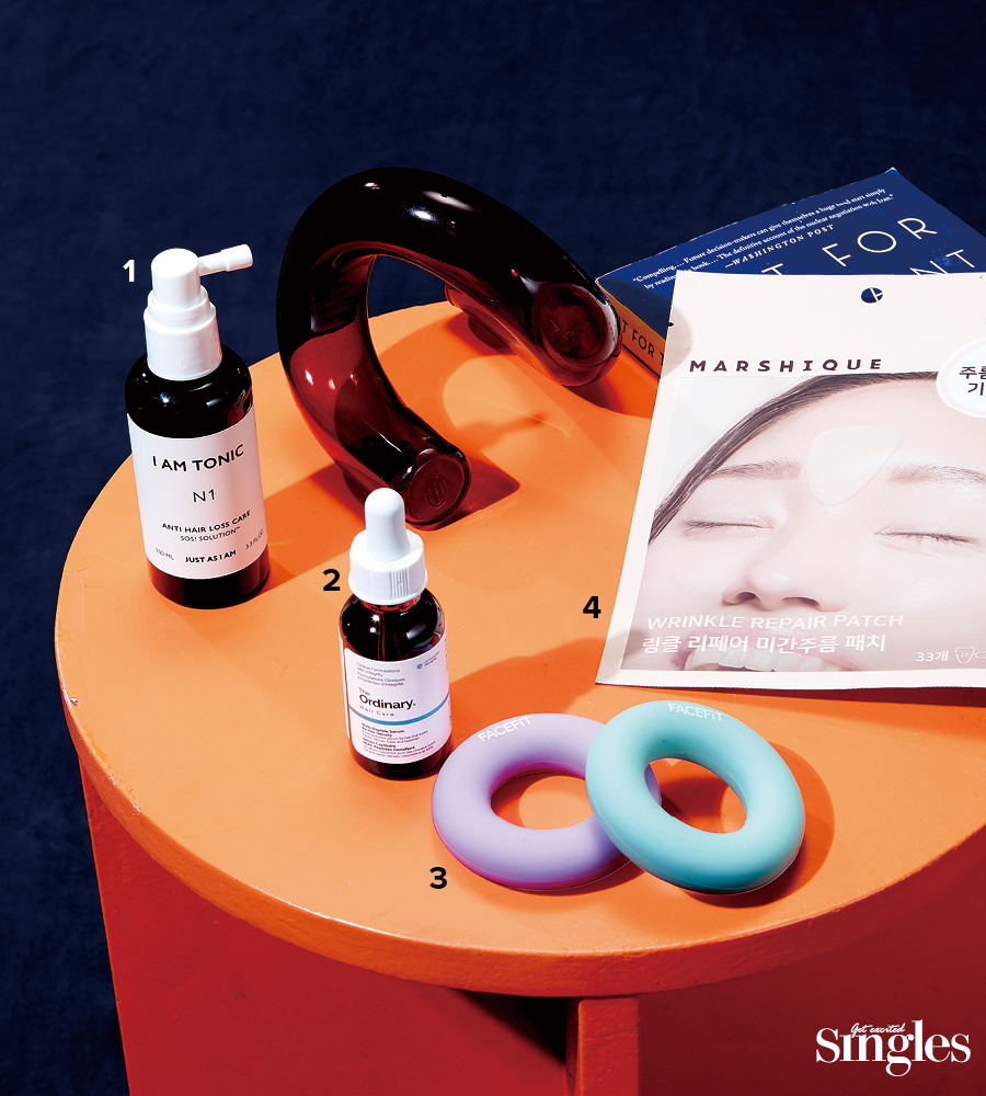1 저스트아이엠 아이엠 토닉 N1 안티 헤어 로스 케어 탁월한 쿨링감을 선사해 두피의 열감을 즉각적으로 완화하고 노세범 효과를 갖추어 기름진 두피를 깔끔하게 정돈한다. 100ml 2만8000원. 2 디오디너리 멀티-펩타이드 세럼 포 헤어 덴시티 고농축 포뮬러가 모발을 튼튼하게 가꾸는 두피 전용 세럼. 다양한 자연 유래 추출물이 두피 컨디션을 건강하게 바꿔준다. 30ml 1만6200원. 3 페이스핏 링 강력한 밀착력으로 강하게 유착된 근육이나 두꺼운 조직을 이완시킬 수 있는 도구. 2ea 1만5000원. 4 마르시 링클 리페어 미간 주름 패치 수분 증발을 차단해 주름 부위에 수분을 채우고 아데노신, 저분자 마린 콜라겐, 토코페롤의 유효 성분을 흡수시켜 피부 탄력을 집중적으로 케어한다. 1만 2900원.