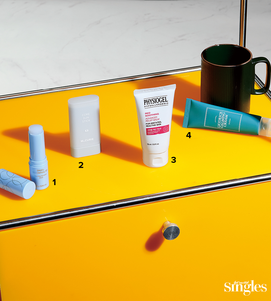 1 더샘 스네일 에센셜 이엑스 쿨링 솔루션 스틱 청량한 쿨링감을 선사하고 황금달팽이 콤플렉스와 수분 에센스를 함유한 고수분 텍스처가 진한 영양을 충전한다. 11g 2만8000원. 2 엠퀴리 코어 선 스틱 SPF50+ PA++++ 공기처럼 투명하게 밀착해 여러 번 덧발라도 밀리지 않는다. 다크 스폿, 주름을 완화하는 멀티 기능의 선 스틱. 18g 3만 2000원. 3 피지오겔 레드 수딩 어드밴스드 릴리프밤 보습 장벽을 강화해 각질을 잠재우고 붉은 기, 가려움까지 개선한다. 뺨, 눈가 등 예민한 얼굴 부위에도 안심하고 사용 가능하다. 75ml 3만6500원. 4 아임 프롬 리코리스 카밍 크림 민감한 피부에 효과적인 익산 민감초 엑소좀 1억 개를 담아 진정 효과를 부여한다. 바르는 즉시 피부 깊숙이 수분이 채워져 매끈한 피부결로 거듭난다. 50ml 2만8000원.