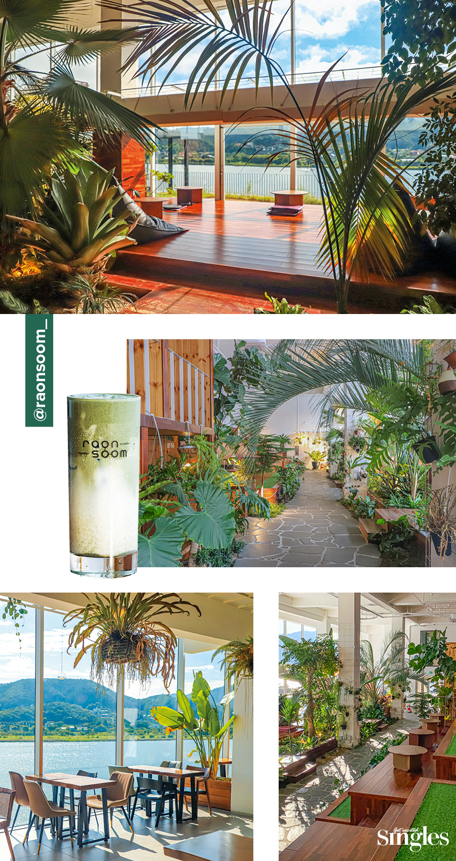 라온숨은 즐거움을 뜻하는 순우리말 ‘라온’과 숨 쉬다의 ‘숨’이 합쳐진 대형 식물원 카페다. 라온숨은 5층 규모로 층마다 각기 다른 테마로 운영된다. 1층은 큰 식물부터 작은 식물까지 다양한 식물이 식재되어 있고, 2층은 북한강 뷰가 가장 아름다운 리버뷰 명소다. 3층은 젊은 작가들을 발굴하기 위한 취지로 운영되는 갤러리로 때마다 다양한 미술작품을 감상할 수 있다. 4층은 대관 전용, 5층은 캠핑 콘셉트로 꾸며졌다. 이 건물은 한마디로 숨을 쉬는 거대한 유기체 같기도 하다. 1층 식물관 바닥에 설치된 물배관은 전자 제어를 통해 식물이 자라기에 적절한 습도를 내내 유지하고, 내부의 공기 정화 시스템은 더욱 상쾌한 환경을 조성한다.