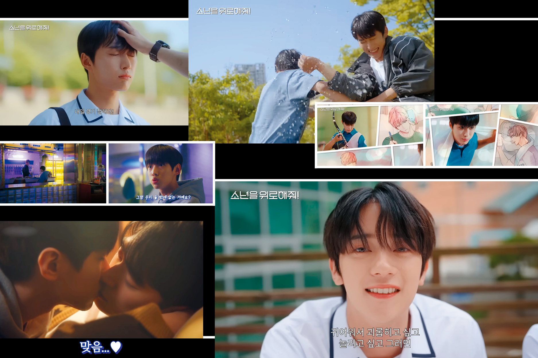 네이버 시리즈온, 헤븐리, 쿠팡플레이 등에서 공개된 <우리 연애 시뮬레이션>(이하 ‘우연시’)도 입소문을 타며 호평을 얻고 있다. <우연시>는 남자 주인공이 7년 전 첫사랑을 회사에서 재회하면서 벌어지는 오피스 로맨스다. <우연시>는 캐스팅, 배우들의 케미, 서사까지 3박자를 고루 갖춘 ‘웰메이드 웹드라마’란 평가를 받으며 1회부터 8회가 공개된 4주 동안 네이버 시리즈온의 월간, 주간, 일간 방송 부문 시청수 랭킹 1위를 차지했다. 웨이브, 티빙, 왓챠에서 볼 수 있는 <소년을 위로해줘!>(이하 ‘소년위로’) 역시 반응이 심상치 않다. 아이돌 그룹 오메가엑스의 재한과 예찬이 출연하면서 국내 BL 드라마 최초로 같은 아이돌 그룹 멤버가 커플 역할로 출연하는 작품이다. <소년위로>는 공개 채널이 3개로 분산됐음에도 불구하고 공개된 달에 왓챠 TV 프로그램 TOP 10에서 1위를 달성하기도 했다.