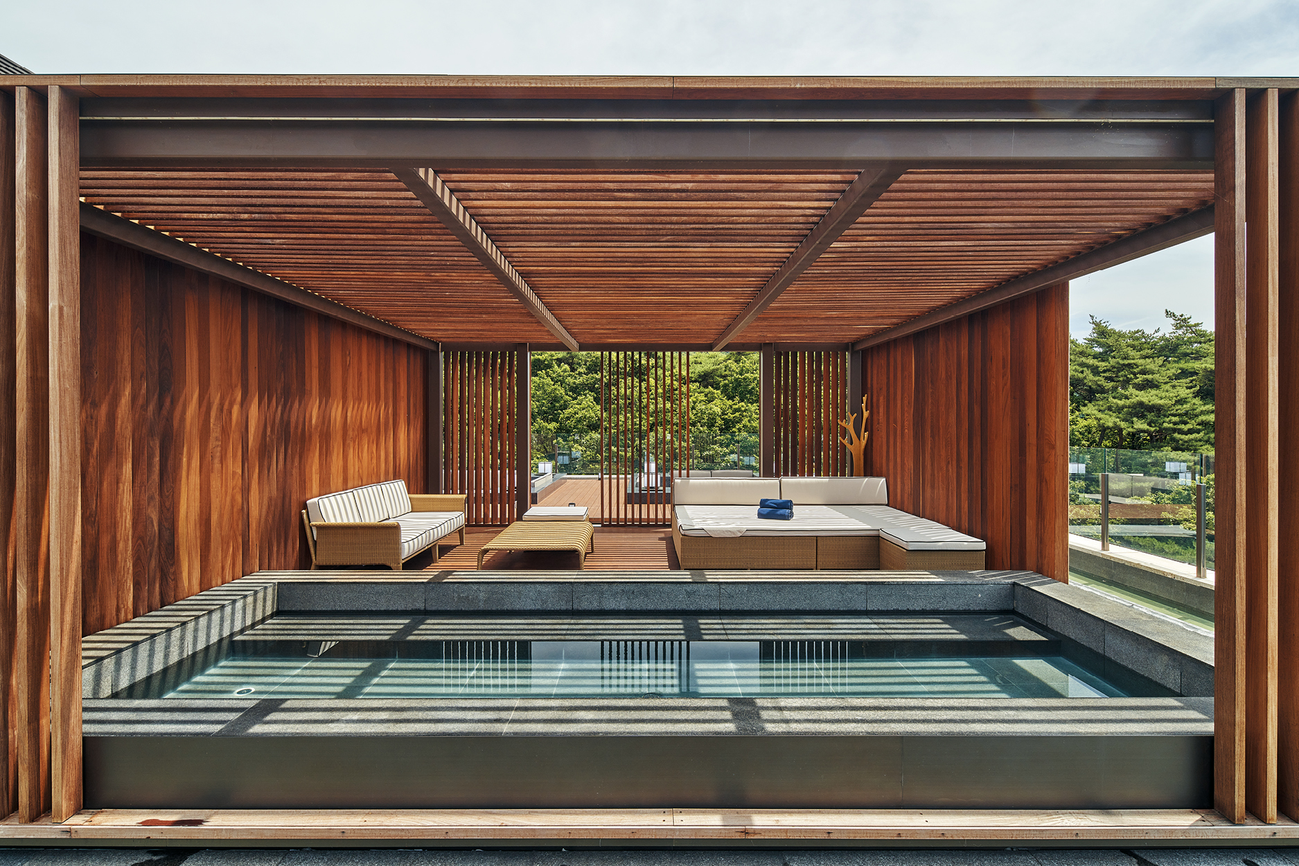 레스트리 루프톱에 위치해 따뜻한 물에 몸을 담그고 포레스트 뷰를 감상할 수 있는 브이탑 스파의 전경.