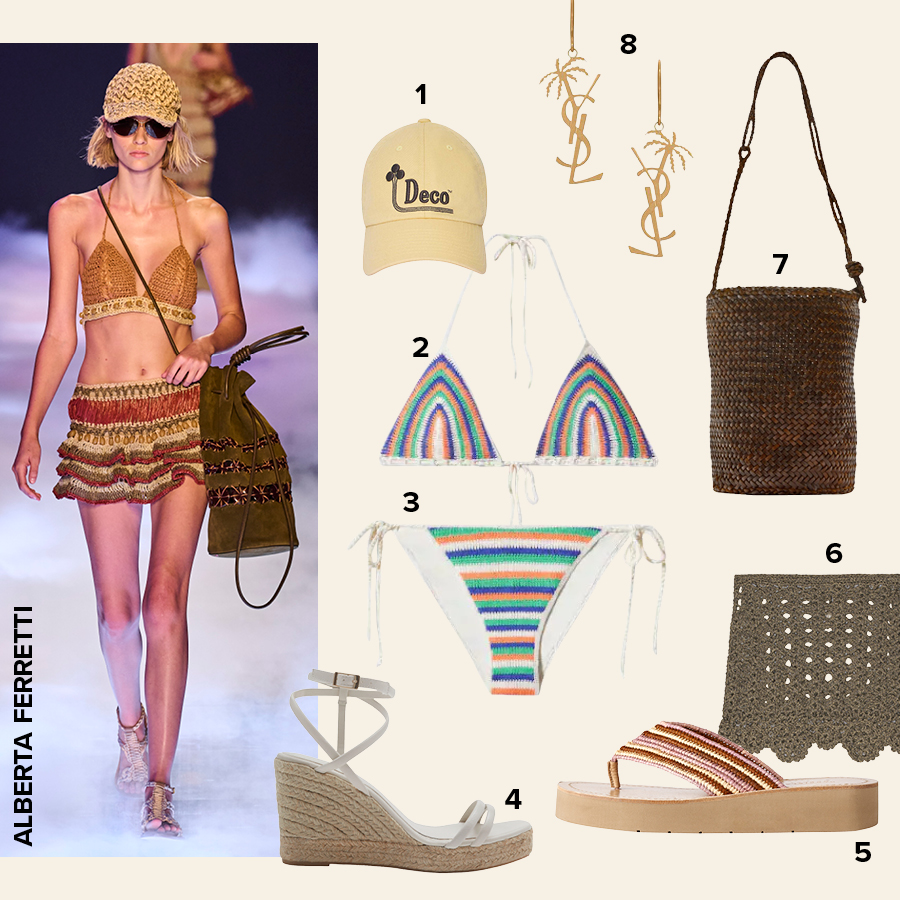 허리선과 복근을 다듬는 고된 준비 동작이 필요하지만, 이로 인한 귀찮은 감정보다 비키니를 입고 싶은 욕망이 앞서는 법이다. 고탄성 우레탄 섬유로 만든 스판덱스가 일반적이지만, 이번 시즌은 좀 더 정교한 소재가 눈길을 끈다. 크로셰 수영복은 주로 톡톡 튀는 컬러의 여러 원단을 엮어 제작하기 때문에 비키니가 가진 관능성에 경쾌한 맛을 더해준다. 몇 시즌 내내 캐주얼한 쇼피스를 제작해온 알베르타 페레티도 스톤 장식을 두른 크로셰 비키니 톱을 새로운 계절의 키 아이템으로 제안했다. 런웨이 룩처럼 비슷한 스타일의 크로셰 스커트를 착용해도 좋고, 패턴이 화려한 사롱 스커트와 함께 변주를 꾀하는 것도 방법이다. 볼캡과 끈이 긴 버킷백 등 편안하고 멋스러운 아이템까지 매치하면 펍 한켠에서 음악과 맥주도 즐기기 좋은 힙한 서머 룩이 완성된다.