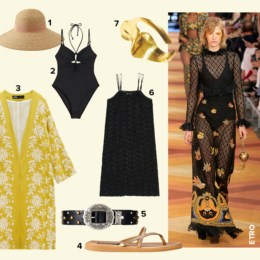 한동안 레트로 트렌드가 이어지면서 패턴이 화려하거나 레터링을 더한 원피스 수영복이 강세를 보였다. 사실 원피스 수영복은 비키니에 비해 노출 부위가 적기 때문에 입기에 부담이 덜하고, 패턴과 배색, 디자인에 따라 수용할 수 있는 체형의 범위가 넓은 아이템. 바다 대신 호텔 안에서 보내는 시간이 많거나 과한 노출은 지양하고 싶다면 블랙 컬러의 원피스 수영복을 선택하는 것이 현명하다. 자칫 평범해질 수 있는 바캉스 신이 걱정된다면 네크라인이 깊게 파인 원피스나 패턴이 크고 화려한 로브를 수영복 위에 걸쳐보자. 볼드한 디자인의 실버 또는 골드 주얼리도 제 역할을 톡톡히 할 것. 챙이 넓은 라피아 모자와 허리선을 가늠해 줄 와이드 벨트도 반드시 챙기자.