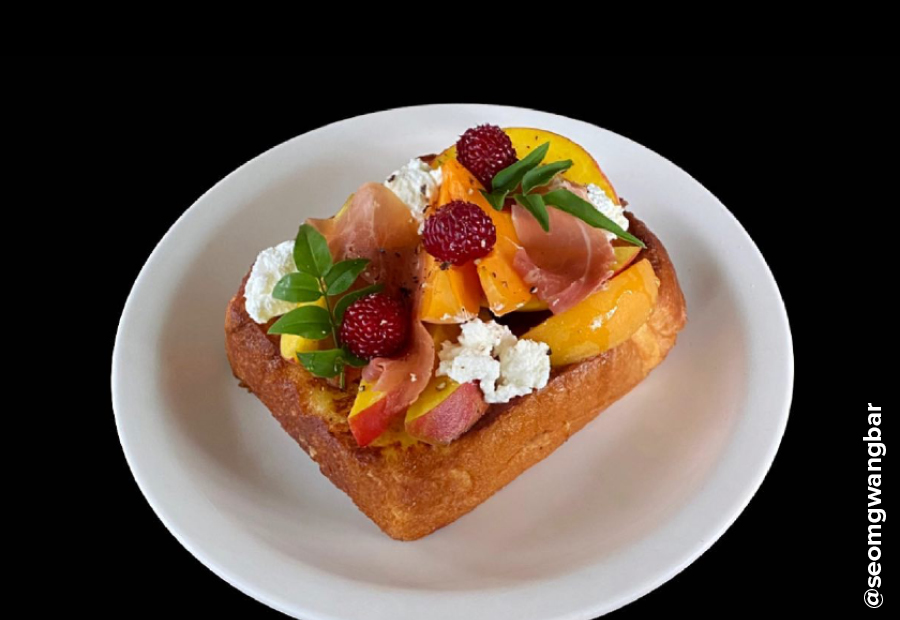 과일 디저트를 사랑하는 사람이라면 충무로 섬광의 과일 토스트를 놓쳐서는 안 된다. 바나나 복숭아, 사과, 무화과, 딸기, 라즈베리 등등 시즌에 맞는 과일들이 토스트 위, 가득 쌓여 올라가 있다. 형형색색의 과일과 함께 로즈마리 등의 허브로 데코된 토스트의 모습은 고급스럽고도 아름답다. 그뿐일까. 달걀물에 적셔져 폭신한 빵을 잘라 마음에 드는 과일과 함께 한 입씩 입에 넣으면 각각의 과일이 가진 상큼함과 토스트의 달콤함이 어우러져 행복감을 선사한다. 비주얼과 맛을 모두 사로잡은 프렌치토스트를 원한다면 섬광의 과일 토스트는 실패 없는 선택지다. 과일 프렌치토스트 9000원.