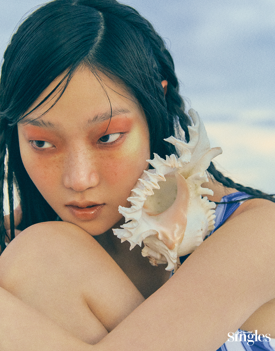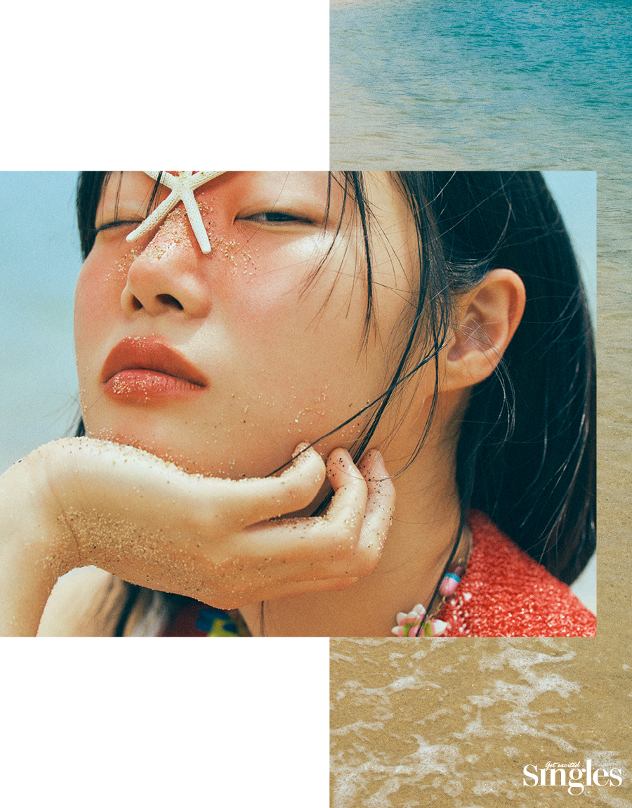소금기를 머금은 모래사장에서 여름 햇살을 한껏 즐겼다. 에너제틱한 느낌을 내기 위해 레드 오렌지 컬러의 크림 치크를 얼굴 중앙을 기준으로 콧대와 양 볼까지 넓게 터치한다. 마찬가지로 입술은 비비드한 레드 오렌지 립스틱을 전체적으로 발라주되, 입술산은 물든 듯이 블렌딩한 것이 포인트. 여름 바다를 온몸으로 즐긴 듯 실제 모래를 얼굴과 손에 그리고 불가사리 오브제를 미간에 붙여 보다 리얼하고 완성도 높은 룩을 완성 했다.