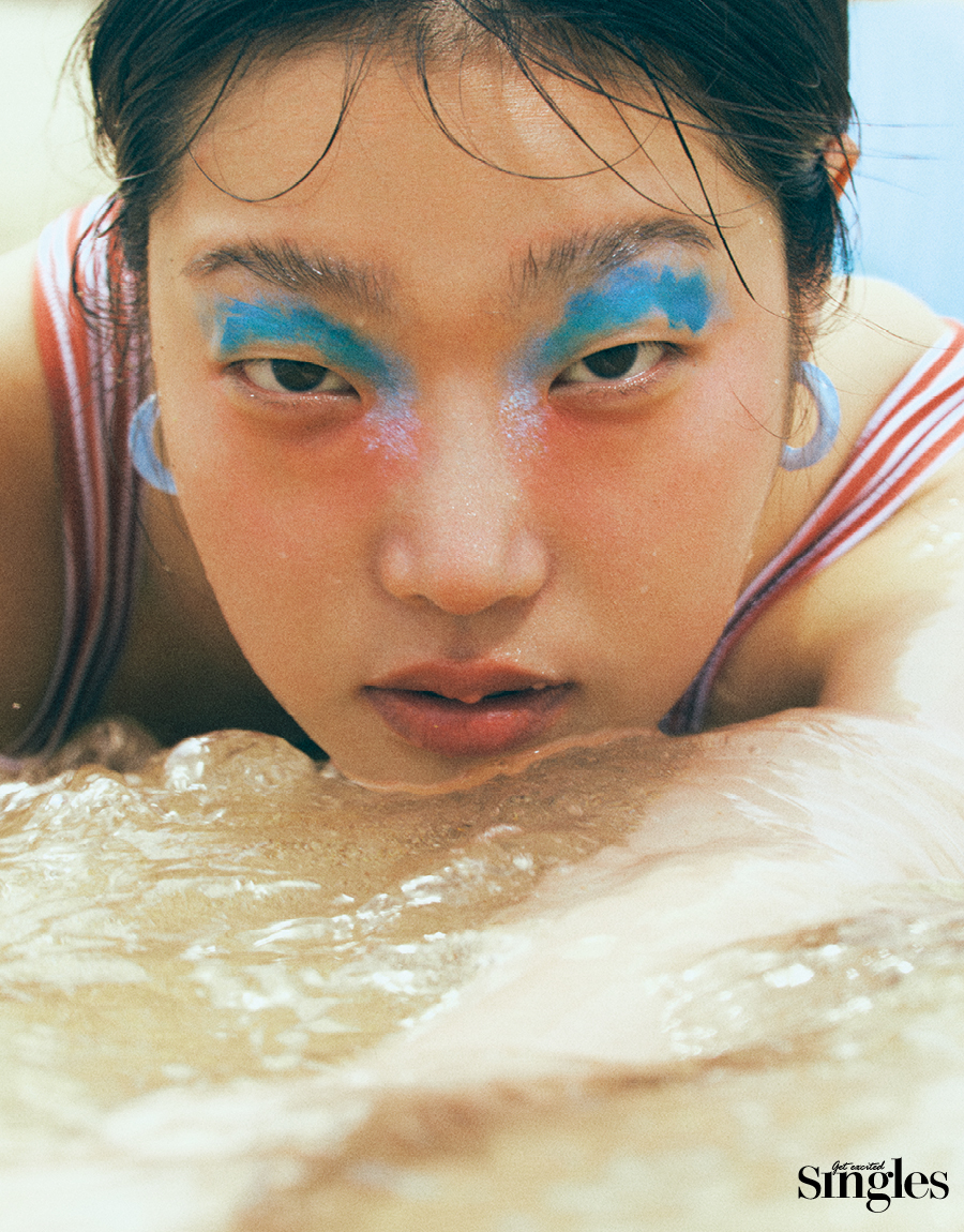 넘실대는 파도의 잔상이 눈가에 펼쳐진다. 시머한 펄감이 있는 시원한 블루 섀도로 밑바탕을 깐 뒤, 눈머리에 스카이 블루 컬러의 섀도를 발라 그러데이션한다. 태양빛을 받아 빛나는 물결을 연출하기 위해 블루 펄이 가미된 립글로스를 눈두덩에 두껍게 올려 광택과 텍스처를 살려준 것. 마무리로는 핫 핑크 블러셔를 눈 밑과 광대뼈에 가볍게 쓸어주고, 글로시한 핑크 컬러의 틴트를 풀립으로 발라 눈만 동동 떠 보이는 이질감을 줄인다.