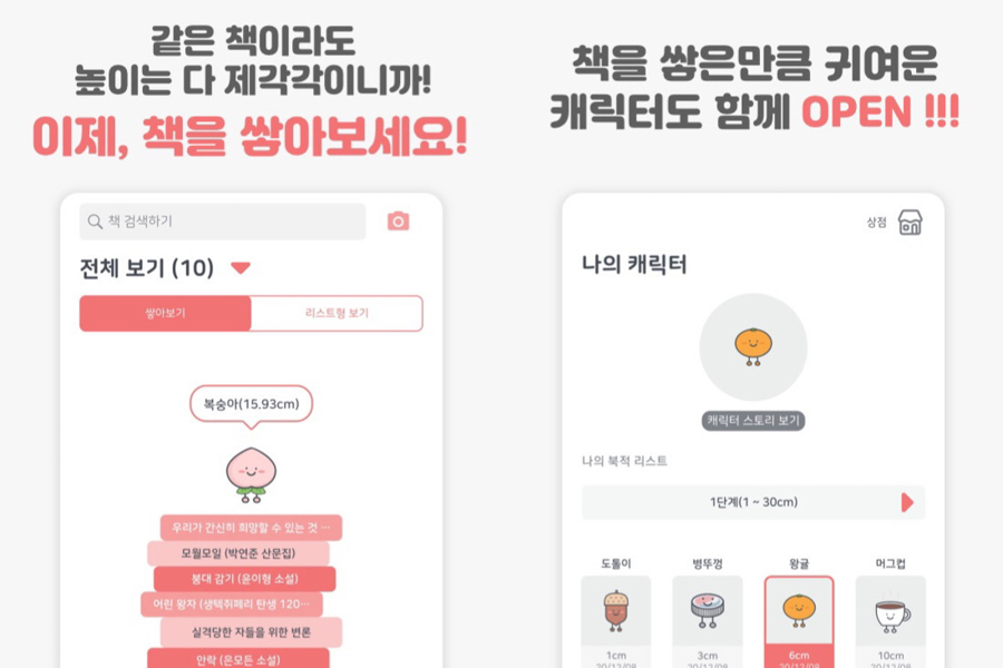 귀여운 북적이 캐릭터가 등장해 당신의 독서를 응원한다. 같은 책 1권이라도 책의 높이는 제각각이라 책을 쌓을 때마다 캐릭터가 바뀌면서 스토리가 열린다. 언제 어떤 책을 읽었는지 기록하며 책 제목과 함께 페이지 수가 시각적이기에 지금까지 읽어온 책의 제목을 보는 것만으로도 책의 내용을 상기시키는 데 도움이 된다. 단순히 기록하는 것이 아니라 평점과 메모 기능으로 감상평과 독후감을 적으며 책에 대한 별점도 메길 수 있다. 독서 현황을 쉽게 기록하고 확인하며 한 달에 N권 읽기를 목표로 세우고 실현해보길.