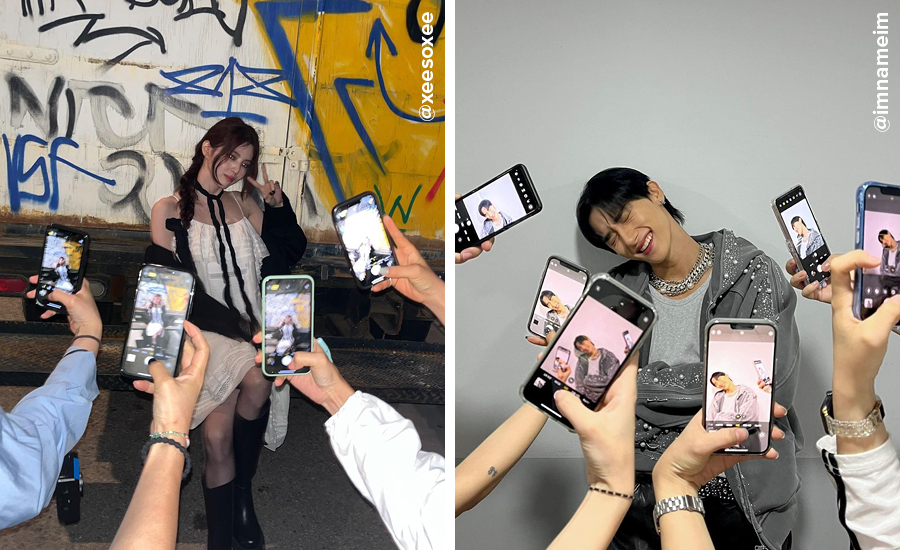 많을수록 더 좋다! 단순히 포즈를 취하는 데에 그치지 않고 나를 둘러싼 여러 개의 스마트폰을 활용해 다양한 인증샷을 완성한 배우 한소희와 몬스타엑스 아이엠. 나를 향한 사람들의 시선을 즐기는 듯 한소희처럼 당당하게 포즈를 취하는 것도 좋고, 아이엠처럼 부끄러워하는 모습으로도 귀여운 사진을 완성할 수 있다.