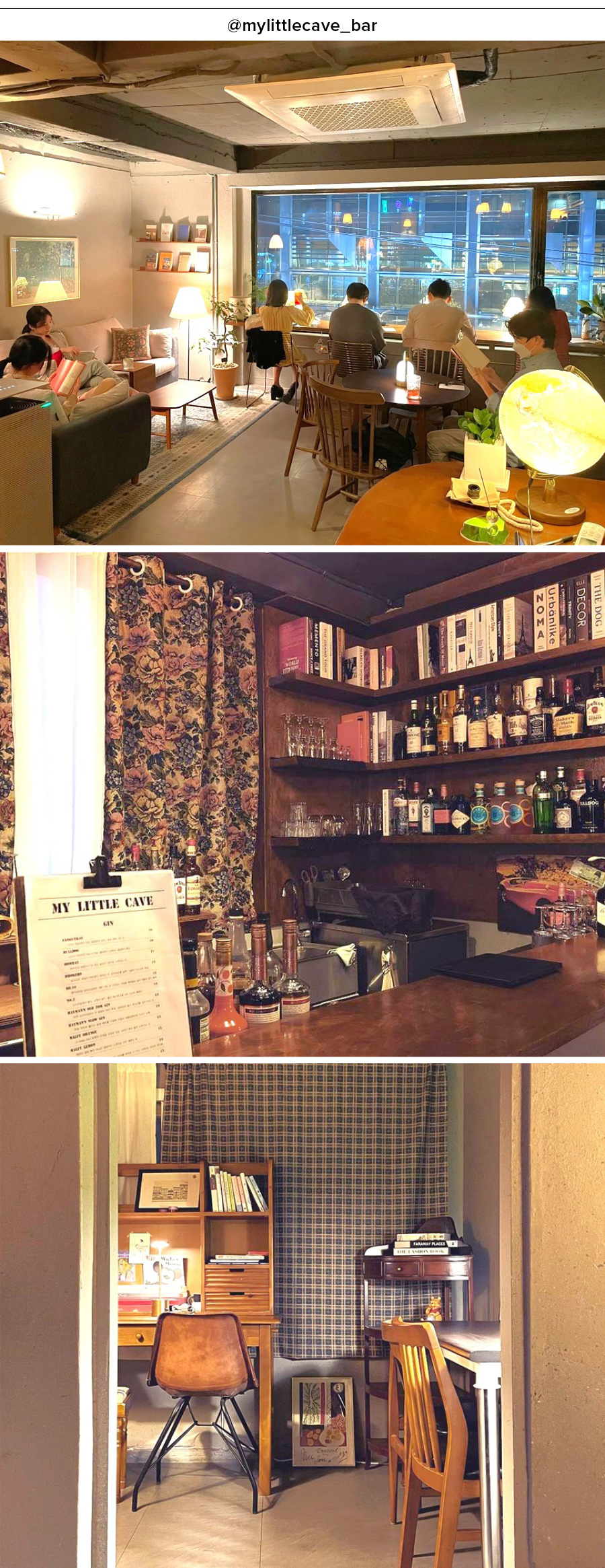 시끄러운 역삼동에서 숨겨진 동굴을 찾는 기분으로 이 북바를 찾아 들어가면, 나만의 아지트 같은 공간이 펼쳐진다. 간판이 작아 워크인으로는 찾기 힘든 마이리틀케이브(일명 ‘마리케’)는 작년 4월에 오픈하여 이제 막 1년이 넘었다. 북바 운영자는 역삼역 직장인 10년 차 출신으로, 현실과는 살짝 동떨어진, 오롯이 나를 위한 쉼의 공간을 만들고 싶어 ‘마리케’라는 이름을 붙였다고 한다. 퇴근 후, 혼자 온 손님이 다양한 진과 책을 함께 즐길 수 있도록 혼술 바도 마련되어 있다. 만약 퇴근 시간 이후에 북바를 즐기기 힘들다면, 평일 오후 반차를 쓴 직장인들을 대상으로 한 ‘오후의 OO(땡땡)이’ 서비스를 이용하는 것도 좋다. 오후의 땡땡이는 2시부터 6시까지 진행되며 무인 예약제로 운영된다.