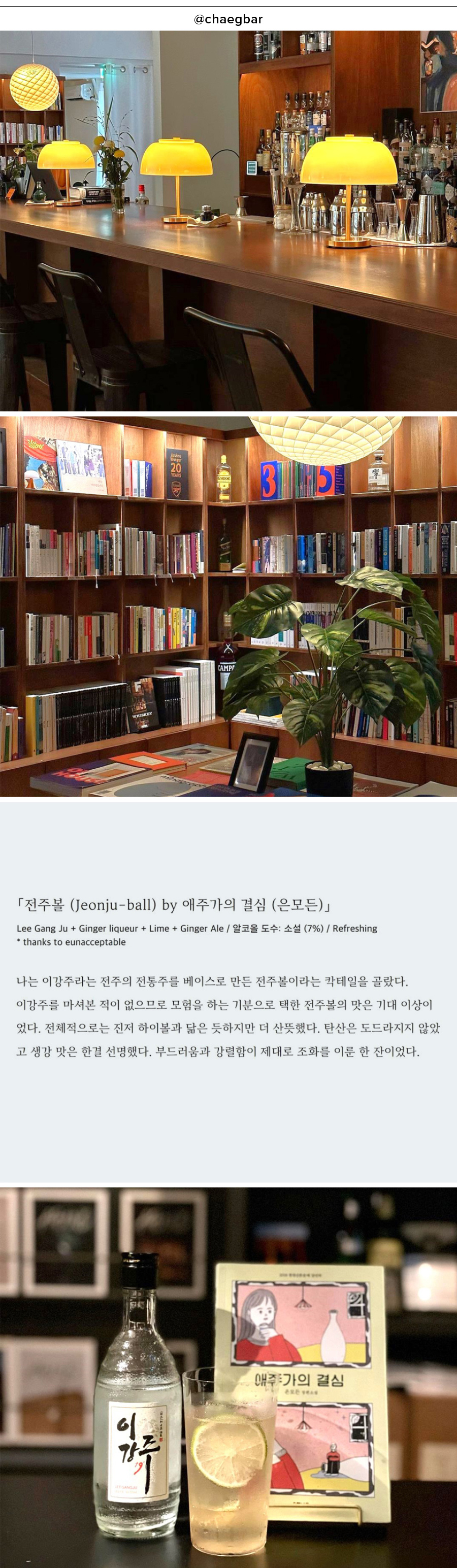 망원동의 한 사거리에 위치한 책바는 최근 인기에 힘입어 가게 확장을 하며 재오픈했다. 입구부터 조용한 피아노 선율이 흐르는 책바에 도착하면 책방지기의 친절한 안내를 받고, 책에 등장하는 술이 포함된 메뉴판 책을 건네받는다. 술 종류는 <면도날>(서머싯 몸, 민음사)에 나오는 ‘압생트 마티니’부터 <1Q84 >(무라카미 하루키, 문학동네)의 ‘커티삭 하이볼’, <애주가의 결심>(은모든, 은행나무)의 ‘전주볼’, <위대한 개츠비>(스콧 피츠제럴드, 민음사)의 ‘진 리키’ 등등. 하이볼을 비롯해 진, 칵테일 등 책 속의 술이 다양하게 제공되며, 알콜을 원치 않는 이들을 위해 논알콜도 마련되어 있다. ‘혼자 오신 분은 더욱 환영’한다는 인사 문구답게 혼자 방문한 사람이 대다수이며 좌석도 바 좌석부터 소파 좌석, 사적인 좌석까지 개개인의 집중을 돕기 위한 콘셉트가 돋보인다. 책 역시 종류별로 구비되어 있으니, 굳이 책을 가져가지 않고도 언제든 방문하여 술과 책을 함께 즐길 수 있다.
