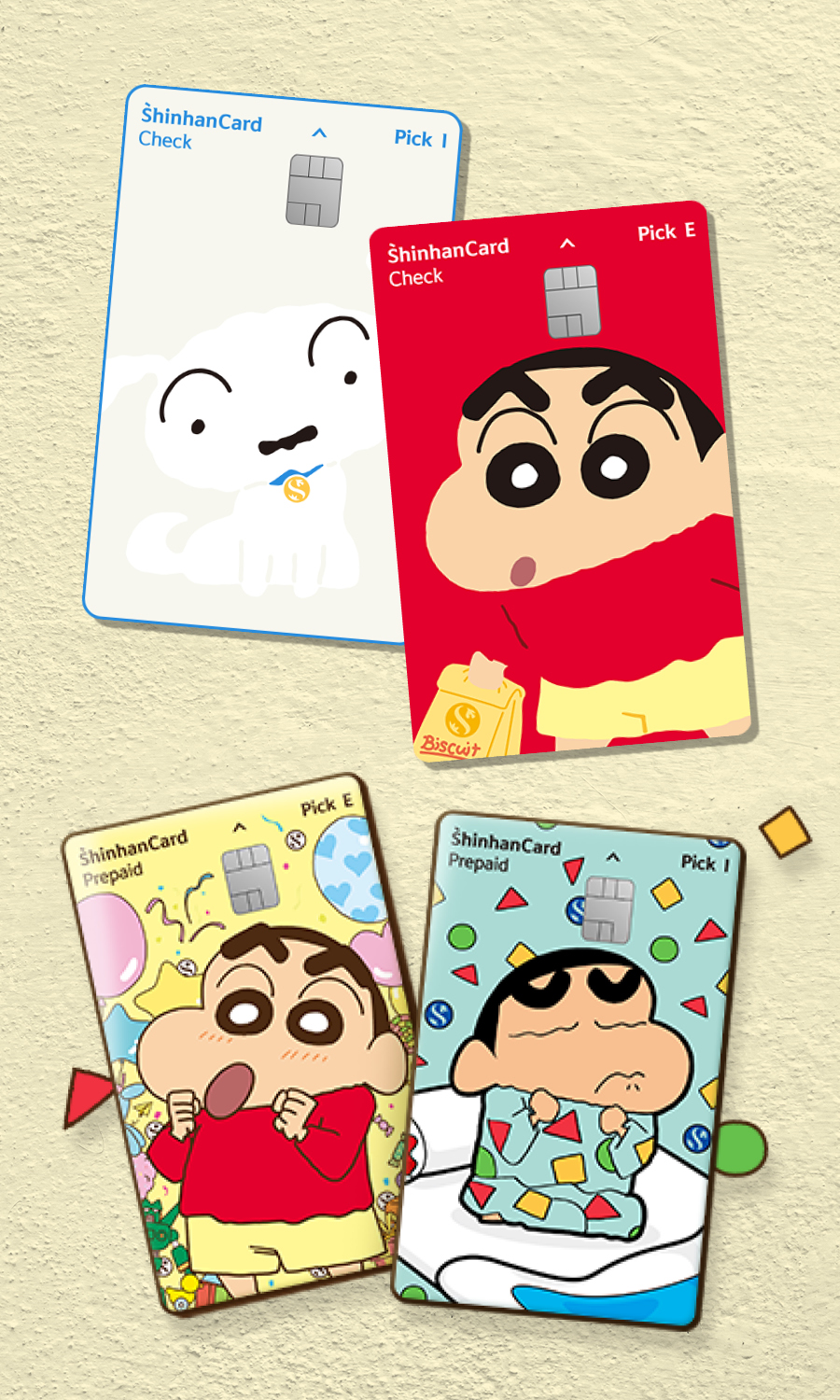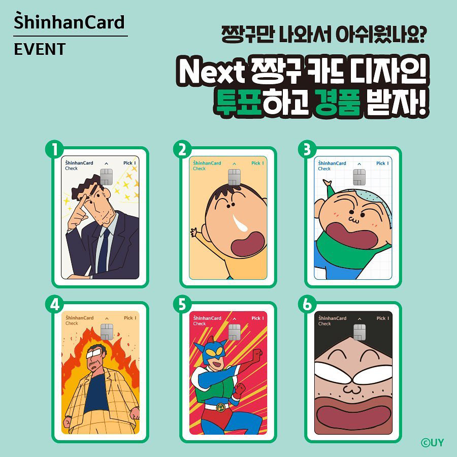 산리오 카드 다음으로 큰 인기를 끈 것은 짱구 카드이다. 짱구 디자인과 MBTI를 활용해 외향적인 E형을 위한 ‘픽 E 체크카드’는 외향적인 짱구 디자인을, 내향적인 I형을 위한 ‘픽 I 체크카드’는 내향적인 흰둥이 디자인을 적용했다. 짱구의 시그너처인 빨간 티셔츠 색인 카드는 앞, 뒤로 살펴봐도 독특하고 귀여워 발급하고 싶은 욕구를 자극한다. 짱구는 남녀노소 가리지 않고 인지도가 높은 대중적 캐릭터로, 모두 자신만의 추억이 담겨있다는 점이 사람들에게 선택받은 요소다.