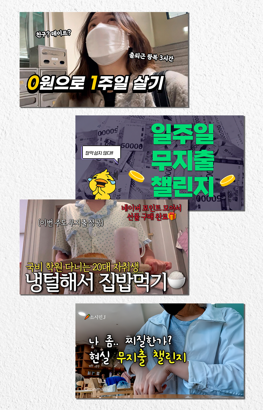말 그대로 無. 소비를 0원에 이르도록 극단적으로 줄이는 챌린지가 유행이다. 고물가로 현실과 미래에 대한 불안이 닥치자 시작된 챌린지로 하루 지출 0원을 인증하는 방식으로 이루어진다. 기본적으로 나가야 하는 비용을 제외하며 한 푼도 쓰지 않겠다는 것인데 생활비 중 가장 큰 지출을 차지하는 식비를 줄이기 위해 배달앱 삭제와 ‘냉파(냉장고 파먹기)’는 기본이다. 가까운 거리는 대중교통 대신 걷기를 택하며 친구들과의 약속은 최소한으로 줄이고, 점심은 도시락 주말엔 집밥으로 해결한다. SNS에는 무지출 하는 법, 무지출 일상 공유 등의 노하우를 알리는 콘텐츠가 확산되며 많은 이들의 동참을 이끌고 있다.