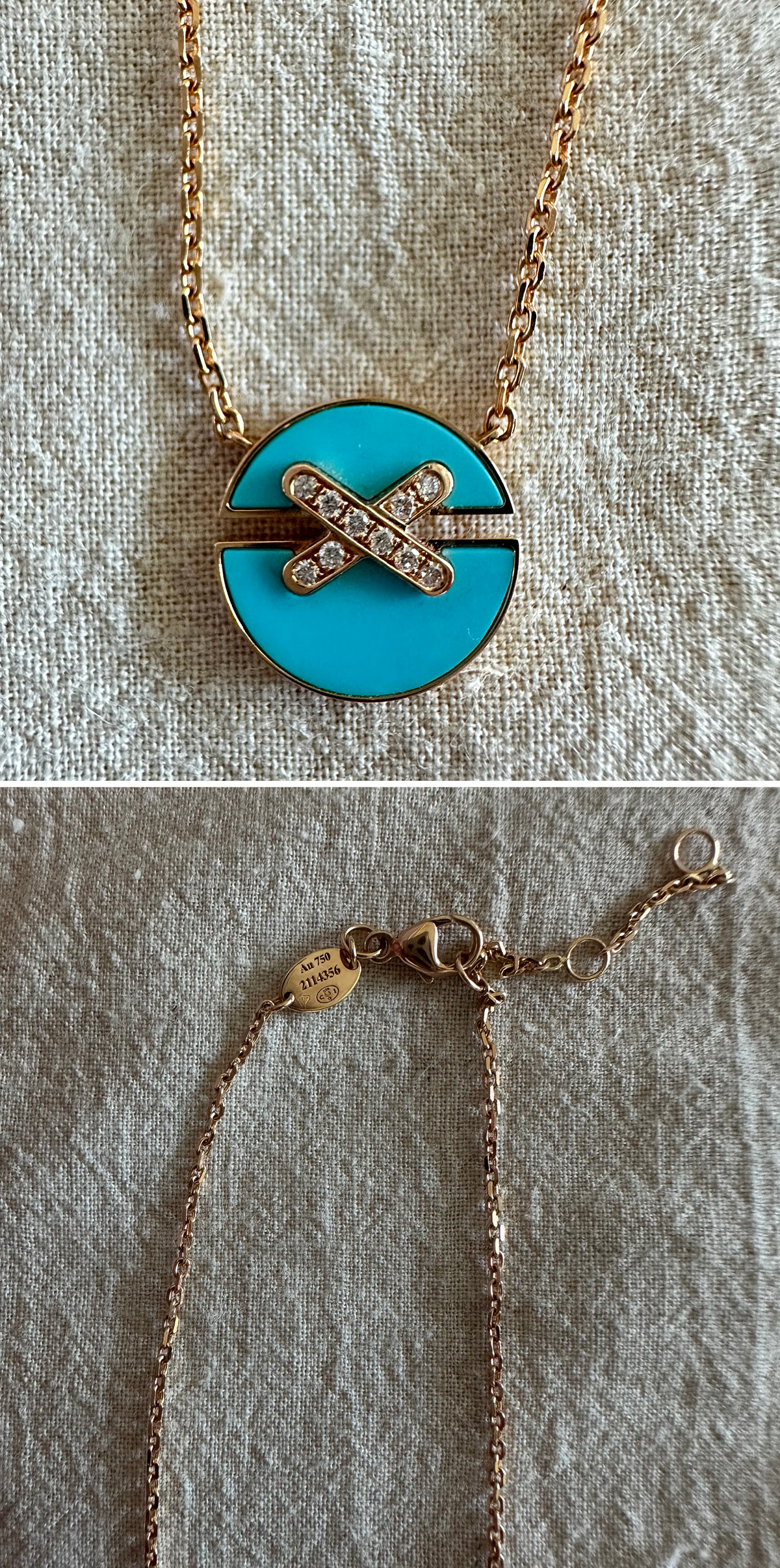 터콰이즈 세팅을 더해 산뜻한 컬러로 재탄생한 주 드 리앙 하모니 펜던트를 직접 마주했다. 핑크 골드 소재와 링크 모티프 위에 얹혀진 10개의 브릴리언트 컷 다이아아몬드가 가장 먼저 시선을 빼앗는다. 완벽과 화합, 영원함을 나타내는 원형의 형태는 비대칭적으로 배치해 모던하고 구조적인 느낌을 더했다. 펜던트 뒤에는 스몰 모델 기준 최대 7자의 인그레이빙을 새길 수 있어 세상에 단 하나 뿐인 선물을 고려 중인 이들에게 제격. 터콰이즈 원석 외에도 다양한 컬러로 출시 중이니 지금 바로 확인해 보자. 쇼핑하러 가기