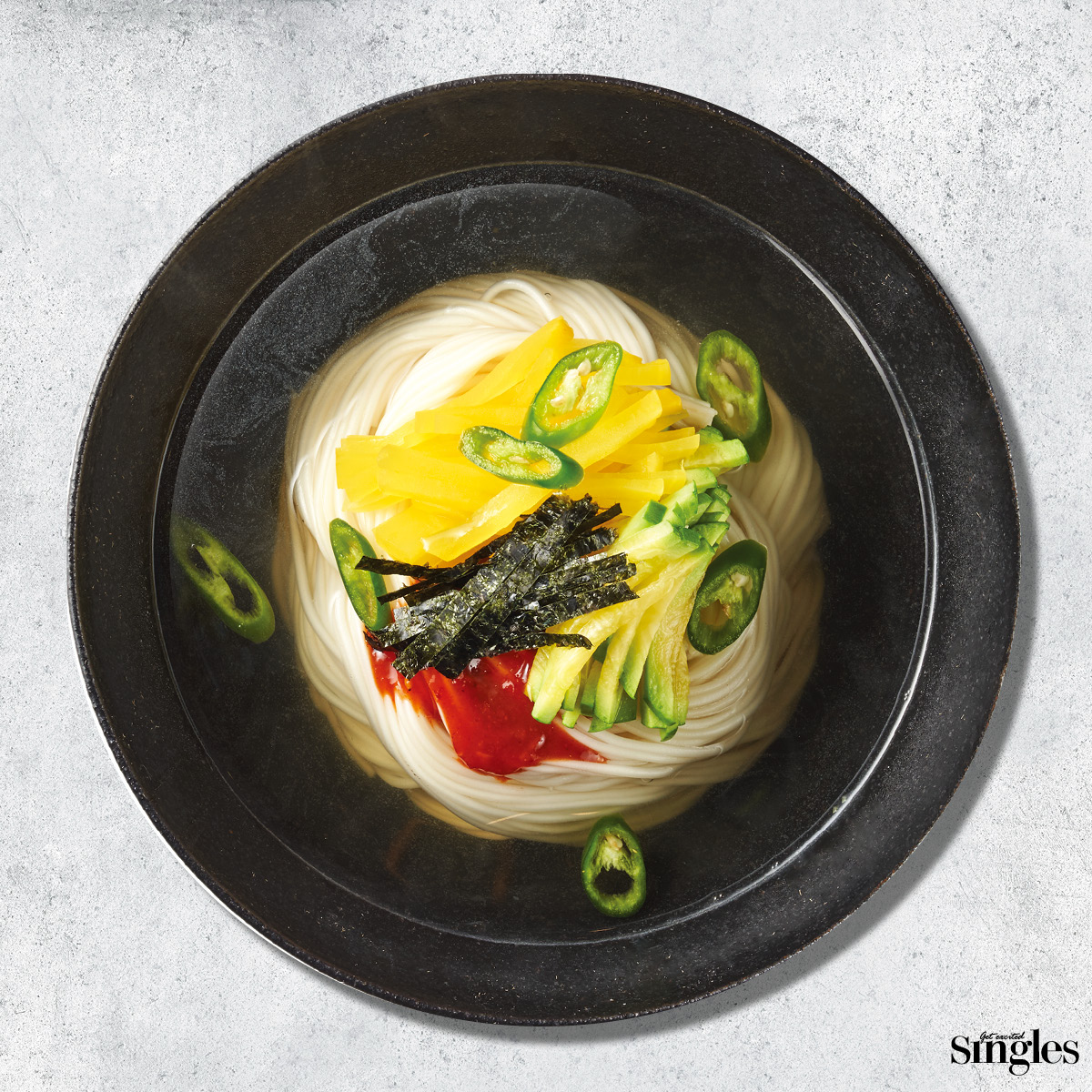 4 미리 만들어놓은 육수를 면기에 부은 다음 애호박, 단무지, 김가루를 고명으로 얹는다.