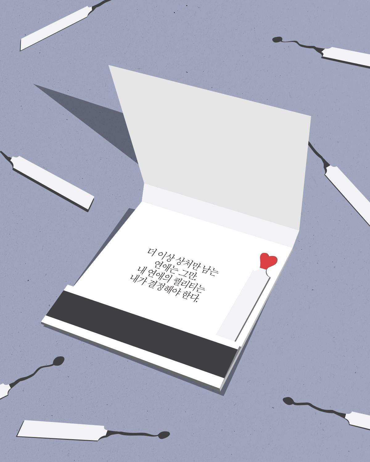 <연애의 참견> <환승연애> <나는 SOLO> <체인지 데이즈>, 각종 채널을 통해 방영 중이거나 최근에 종료한 연애 관련 예능 프로그램이다. ‘연애’라는 공통된 주제를 다루고 있지만 프로그램의 포맷은 제법 다르다. 하지만 이 다양한 포맷의 연애 프로그램 중에서도 반드시 등장하는 유형의 사람이 있으니 바로 ‘소나무 같은 취향’으로 연애를 망치는 사람이다. 우리 주변에도 음식물 쓰레기인지, 재활용 쓰레기인지 종류만 다를 뿐 다양한 쓰레기를 취급해온 쓰레기 컬렉터들이 제법 많다. ‘왜 내 연애는 매번 이럴까’ 하는 고민이 생긴다면 참고해볼 것. 힘든 연애만 반복하는 사람들에게는 공통점이 있다. 물론 당신의 잘못은 아니다. 선량한 마음을 이용한 쓰레기보다 더한 빌런들의 잘못일 뿐. 하지만 빌런이 당신을 쓰레받기로 생각하지 못하게끔 하는 노력도 필요하다. 더 이상 상처만 남는 연애를 반복할 순 없으니.