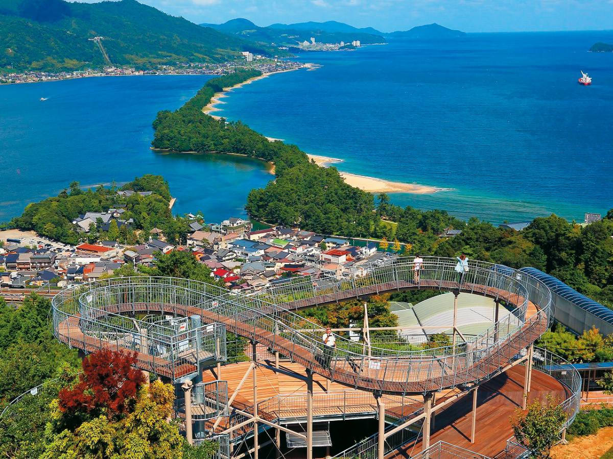 용이 승천하는 모습을 닮은 아마노하시다테 뷰랜드. 몬즈산 정상에 다다르면 일본의 3대 절경 아마노하시다테와 그 너머가 한눈에 보인다. 전망대 혹은 레일 바이크에서 그림 같은 풍경을 눈과 사진으로 담아보자.