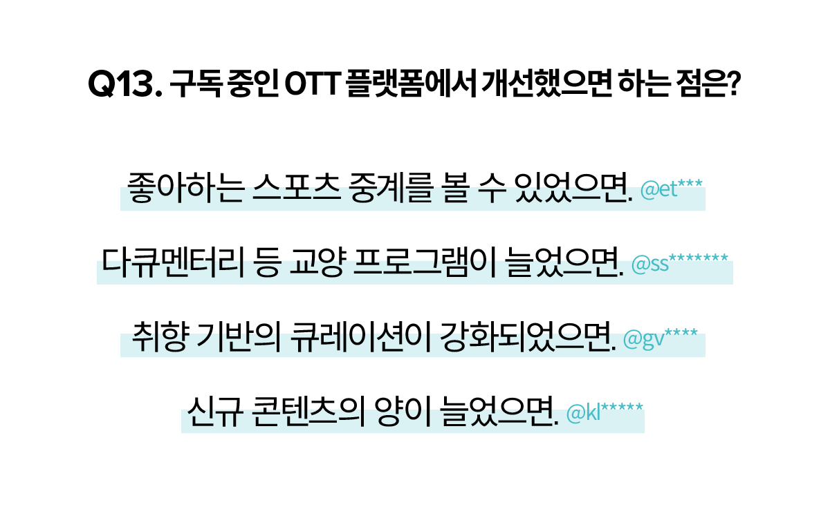 <싱글즈> 설문 응답자들도 스포츠나 다큐멘터리 등 새로운 OTT 콘텐츠에 대한 기대감이 높았다. 그러니까 오히려 지금이 기회일 수 있다. 충성까진 아니어도 시장이 일정 궤도에 오른 지금이 앞으로의 전략을 설정하기에 더 유리한 때가 아닐까. 눈앞의 성장이냐, 2보 전진을 위한 1보 후퇴냐를 선택할 시점이다.