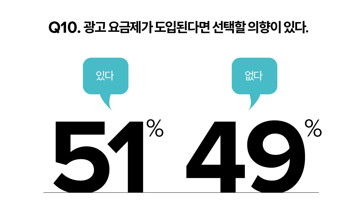 계정 공유 금지 조치에 대한 반응은 유독 차가웠다. 넷플릭스처럼 계정 공유를 금지할 경우 80%가 넘는 응답자가 구독을 유지하지 않겠다고 했다. 다만, 기존 요금제보다 저렴하지만 광고를 봐야만 하는 광고 요금제에 대한 인식은 비교적 느슨했다. 응답자 중 절반은 광고 요금제를 선택할 의향이 있다고 답했기 때문이다.