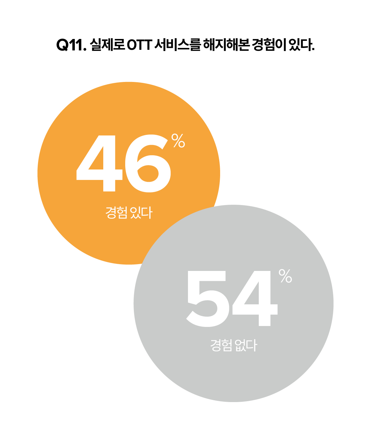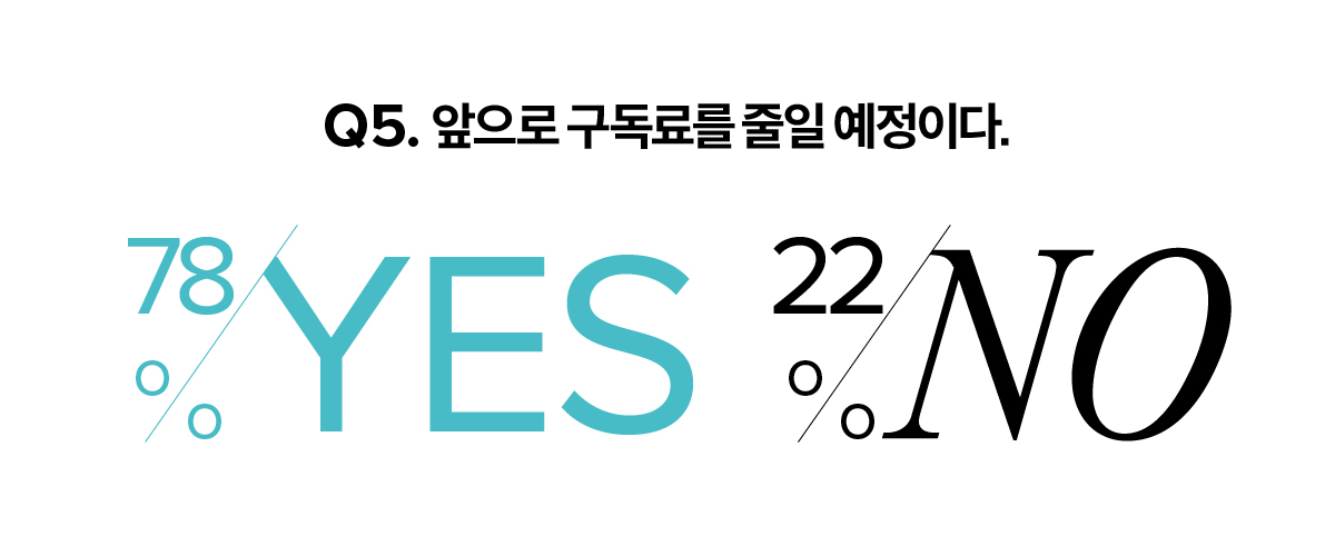 담배도, 술도, 커피도 한번 스며든 기호 식품은 쉽게 끊을 수 없는 것처럼 콘텐츠도 마찬가지다. 지난 10월 건국대학교 천종성 교수는 이라는 논문을 발표하고 20대 OTT 장기 이용자들이 구독을 유지하고 사용하는 데는 만족보다 습관이 더 큰 영향을 끼친다고 분석했다. 천종성 교수는 이런 경향은 OTT 플랫폼 이용 습관이 형성된 후에 더 강화된다고 봤다. 팬데믹을 거치며 자연스레 디지털 소비가 늘어났고, 습관처럼 OTT 플랫폼을 사용하게 된 이용자도 늘어났을 거라는 분석이다. <싱글즈> 설문조사에서도 이와 같은 흐름은 포착됐다. 실제로 OTT 플랫폼 서비스를 해지해본 적 있는 경우는 50%가 채 되지 않았다.