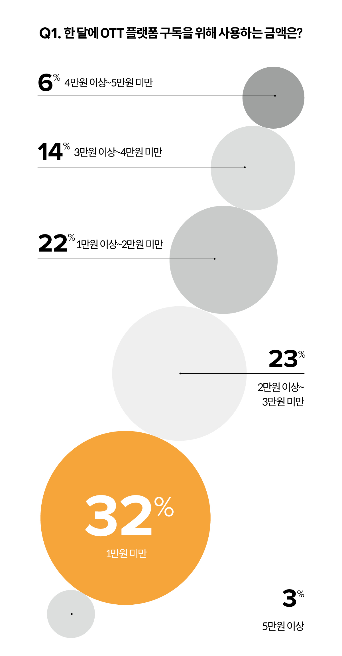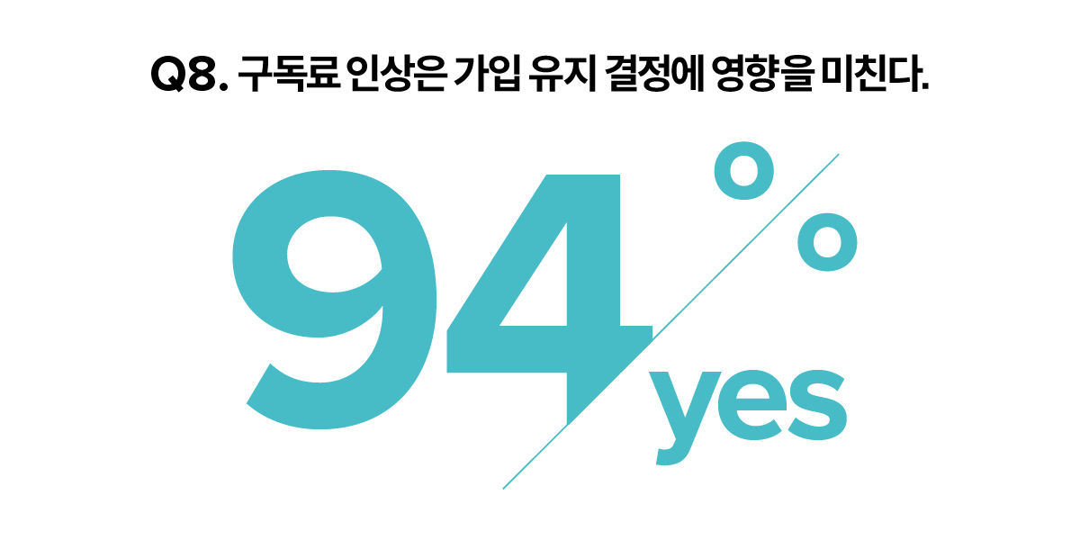 게다가 최근 OTT 플랫폼들이 내놓은 구독 정책 변경 방침은 가입자 유지에 치명적인 영향을 줄 것으로 예측된다. 우선 무려 94%의 응답자가 구독료 인상이 가입 유지 결정에 영향을 미친다고 답했다. 현재 구독 중인 플랫폼이 구독료를 올리면, 상황에 따라 이탈할 수 있다는 뜻으로 해석된다. 게다가 인상 범위에 대한 수용 폭도 매우 보수적이었다. 75%가 1000원 미만의 인상일 때만 구독을 유지하겠다고 했다.