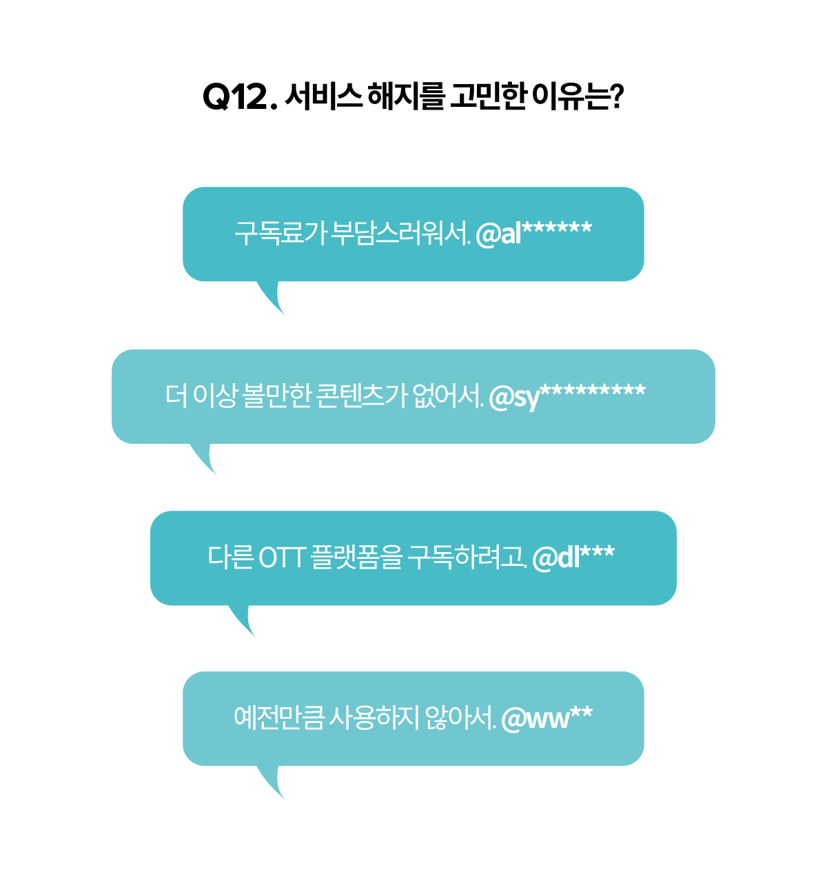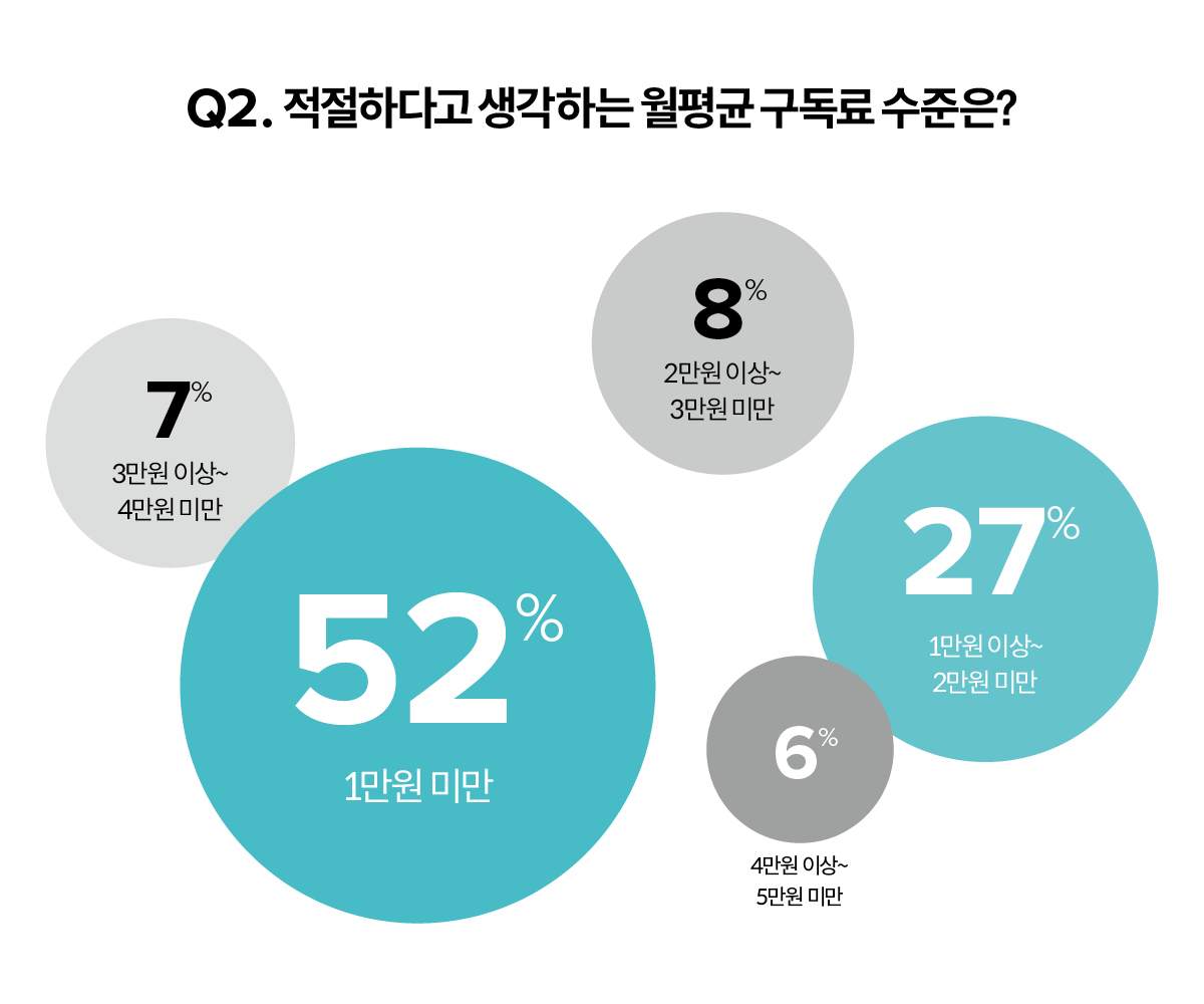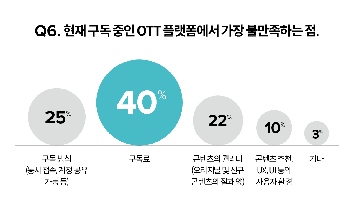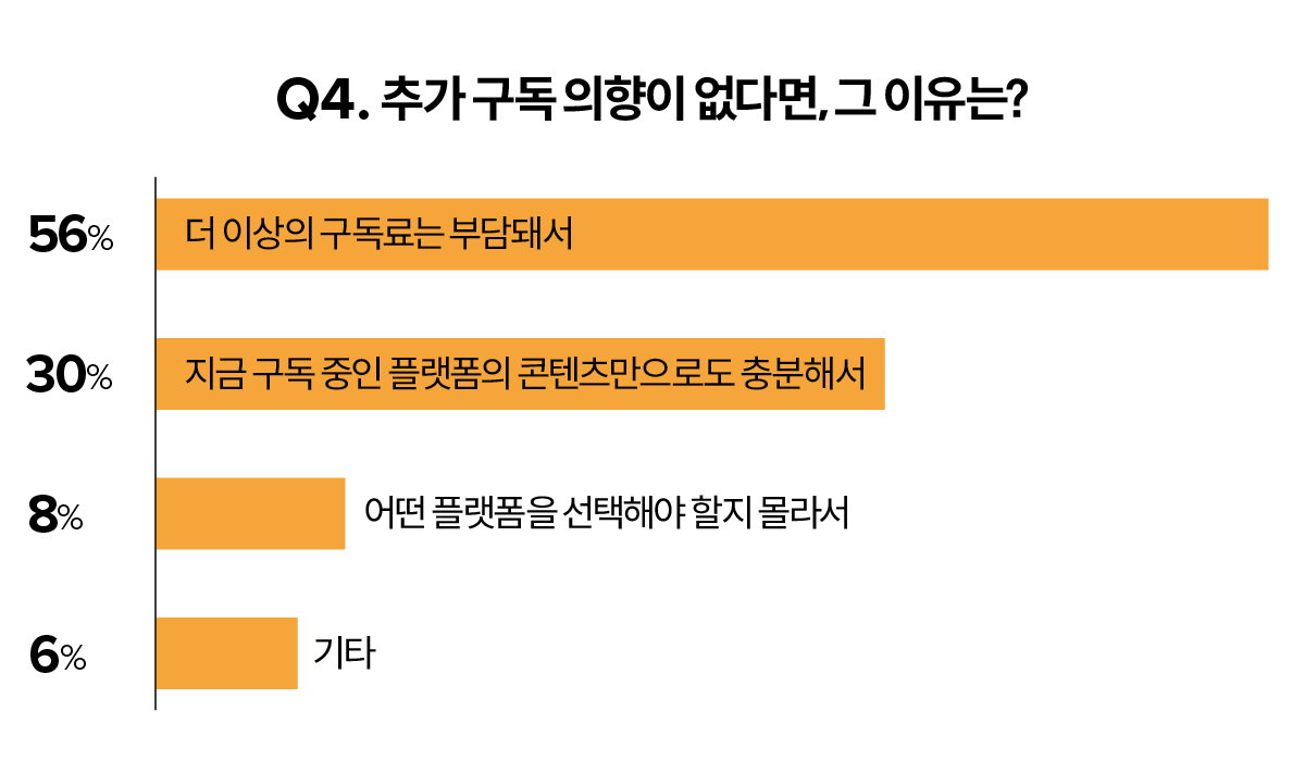 가장 큰 이유는 더 이상의 구독료는 부담되기 때문(56%)이었다. 현재 이용 중인 OTT 플랫폼에서 가장 불만족인 점 또한 구독료(40%)였다. 따라서 10명 중 8명의 응답자는 앞으로 구독료를 줄일 생각이라고 했