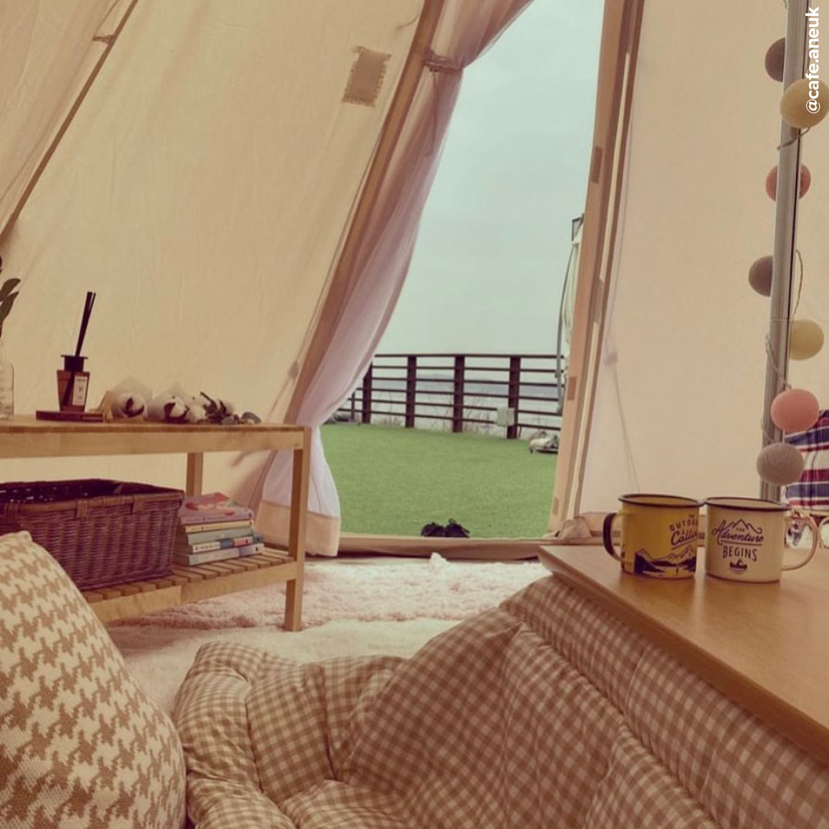 한강뷰를 바라보며 겨울 캠핑을 따뜻하게 즐기고 싶다면? 파주에 위치한 카페 아늑을 주목할 것카페 아늑은 아기자기한 소품과 포근한 인테리어로 이름에서부터 느껴지는 아늑한 공간과 빈백과 텐트, 캠핑 의자 등으로 꾸며진 야외 테라스 공간으로 구성되어 있다. 이곳의 가장 인기 있는 공간은 바로 야외 테라스 텐트 존. 텐트를 열고 들어가 보면 포근한 느낌의 코타츠가 반기는데 달콤한 디저트와 카페 아늑의 시그너처 메뉴 오렌지 라테를 함께 곁들이면 그야말로 낭만 넘치는 겨울 캠핑 분위기를 만끽할 수 있다. 텐트는 최대 1시간 30분 이용할 수 있으며 매장 이용금액이 최소 2만원 이상이어야 텐트 예약을 할 수 있으니 참고할 것.