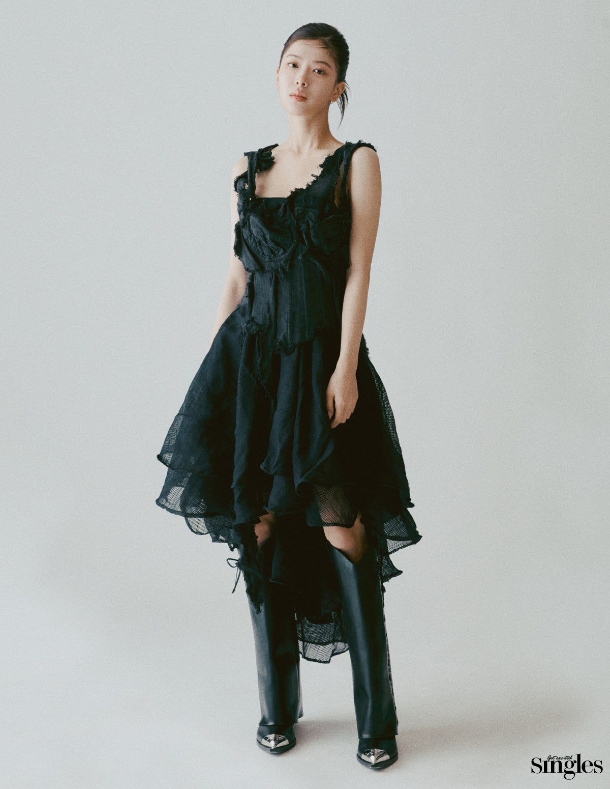 톱 나타샤 진코 by 엠프티, 드레스 규리킴, 레더 부츠 지방시.