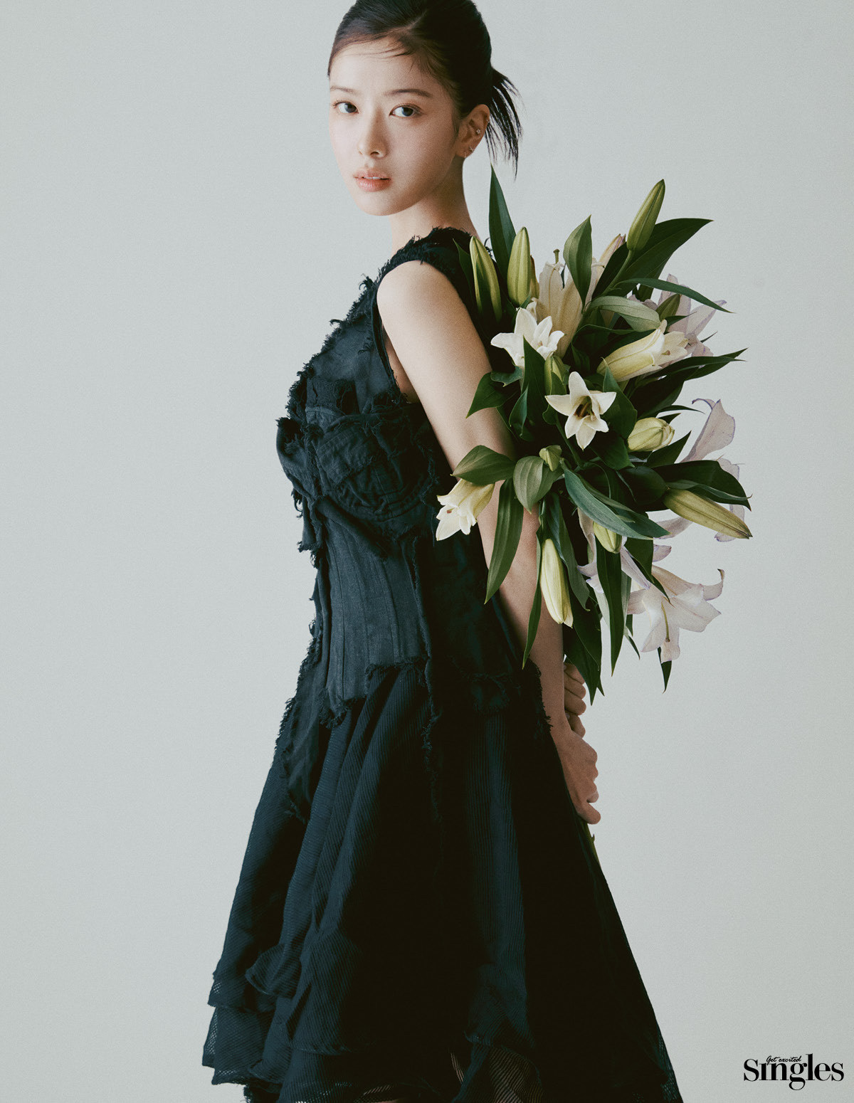 코르셋 톱, 팬츠 모두 규리킴, 플라워 장식 부츠 썬룸, 네크리스 질 샌더