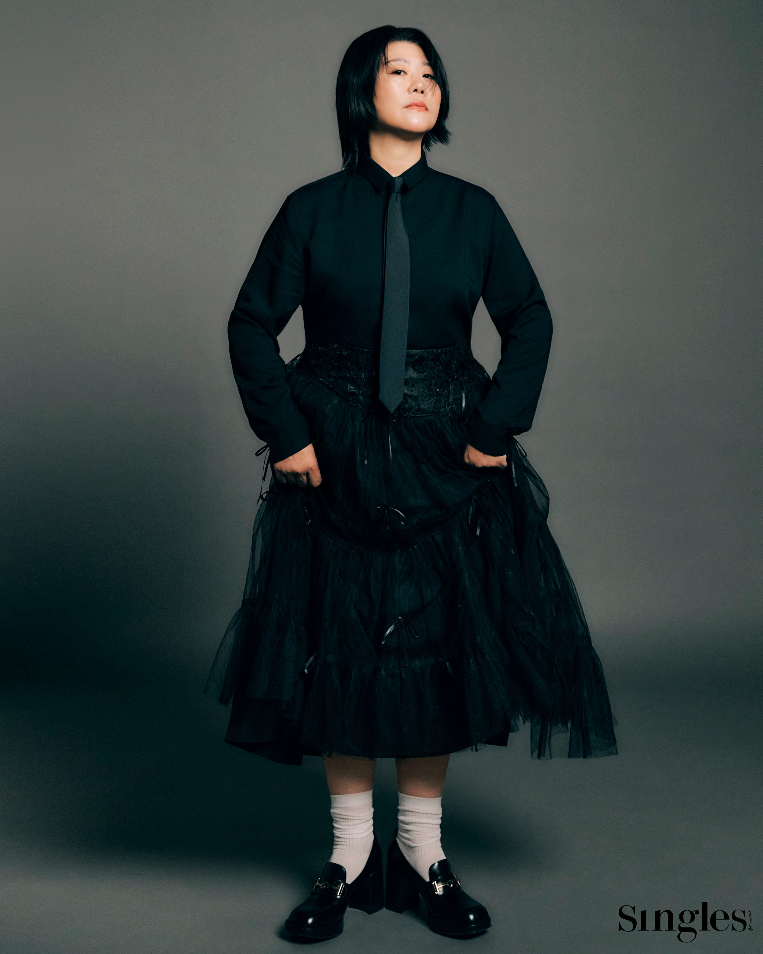 재킷과 스커트는 아크네스튜디오, 셔츠는 코스, 슈즈는 찰스앤키스, 타이는 스타일리스트 소장품.