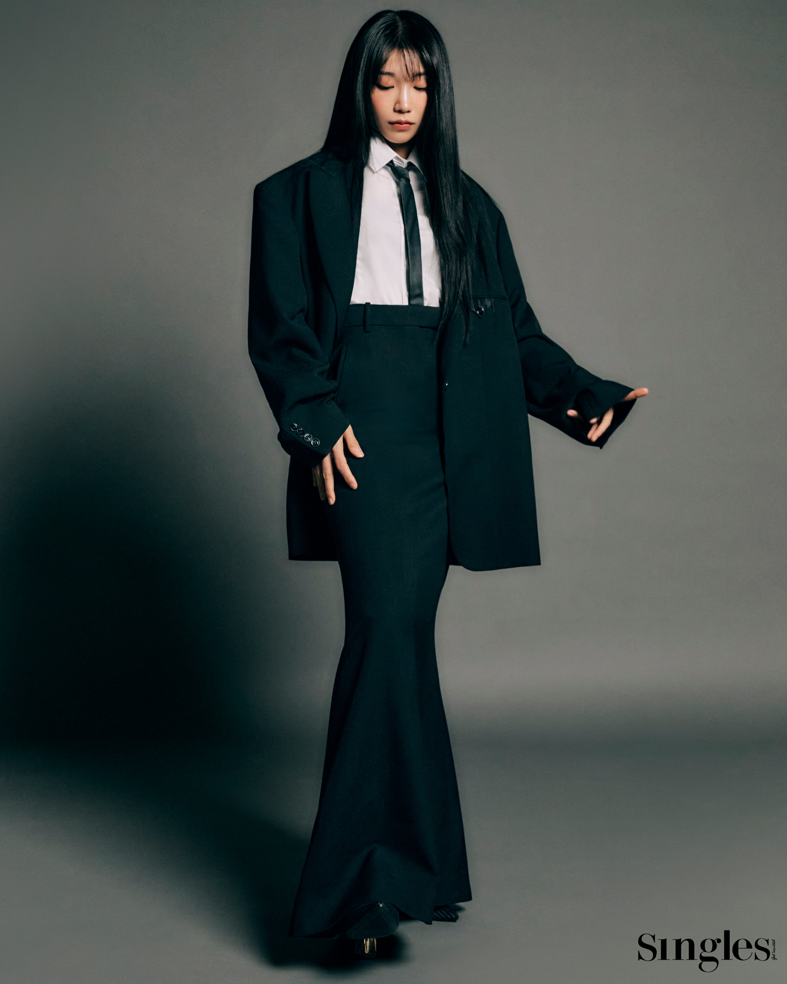 정은지 재킷은 메종마레, 셔츠는 코스, 선글라스는 하이칼라, 타이는 스타일리스트 소장품.