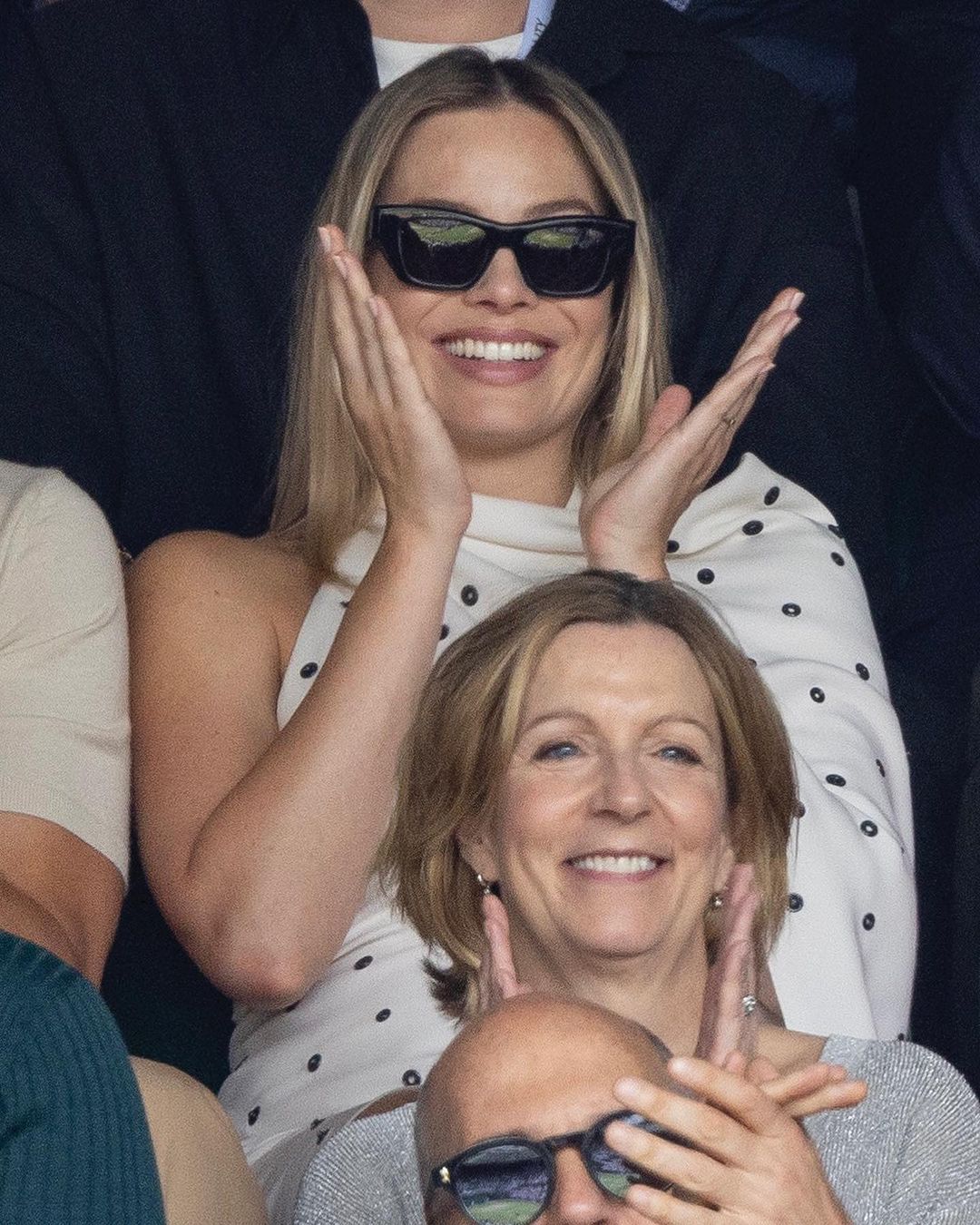 결혼 8년 만의 임신 소식을 알린 배우 마고 로비가 남편 톰 애커리와 함께 참석했다. 마고 로비는 알라이아의 2024 가을 컬렉션인 발랄한 원숄더 디자인의 화이트 도트 원피스를 착용했다. 볼드한 스퀘어 선글라스로 편안하면서도 고급스러운 무드를 완성했다.
