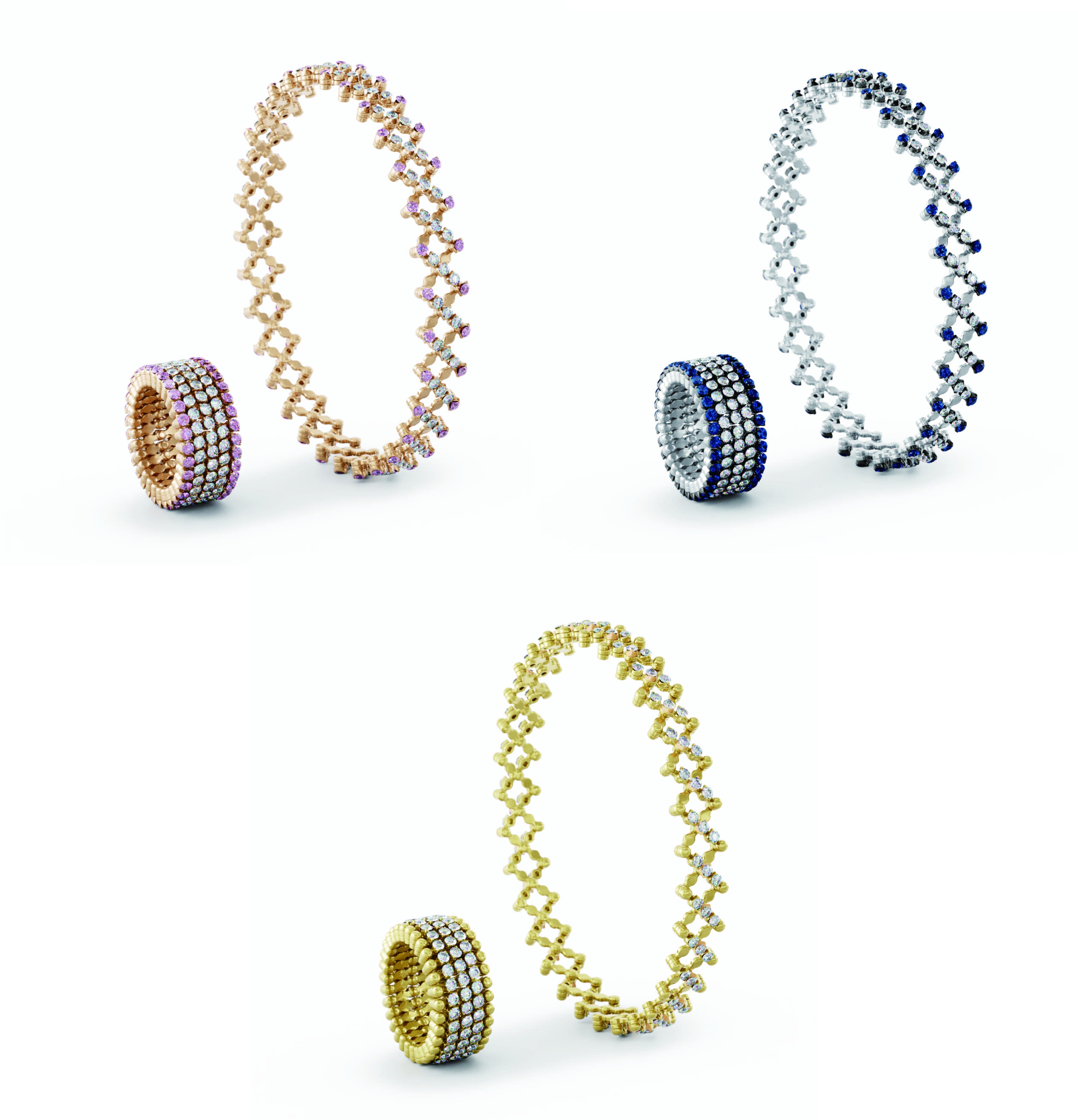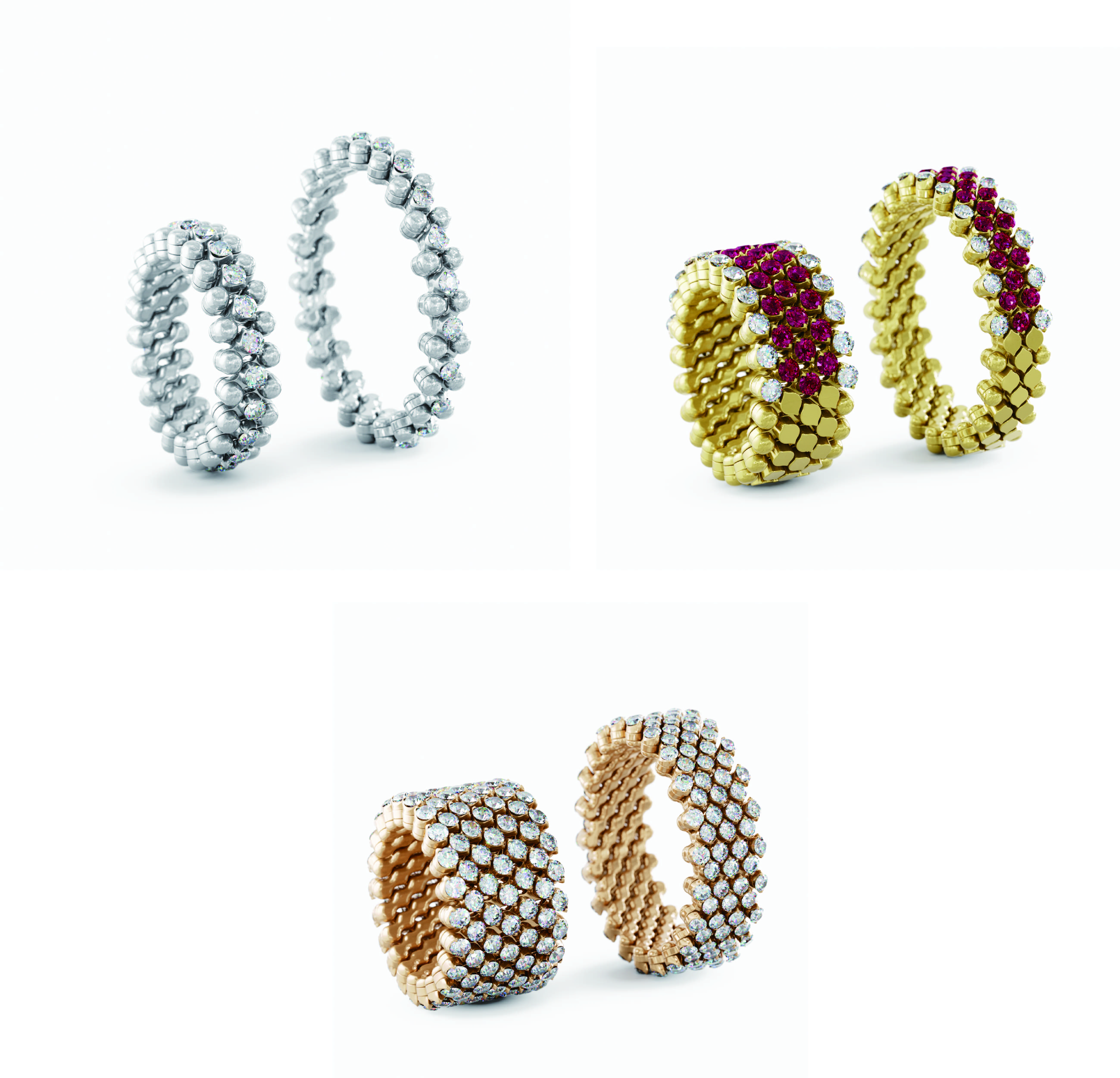 세라피노 컬렉션은 멀티 기능 개념을 극한으로 끌어올린 컬렉션이다. 텍스처를 늘리거나 압축하는 방식을 통해 수백 개의 구성 요소가 확장되거나 수축되면서 링이 브레이슬릿으로, 또 브레이슬릿이 링으로 변화하는 마법 같은 아름다움을 선사한다.