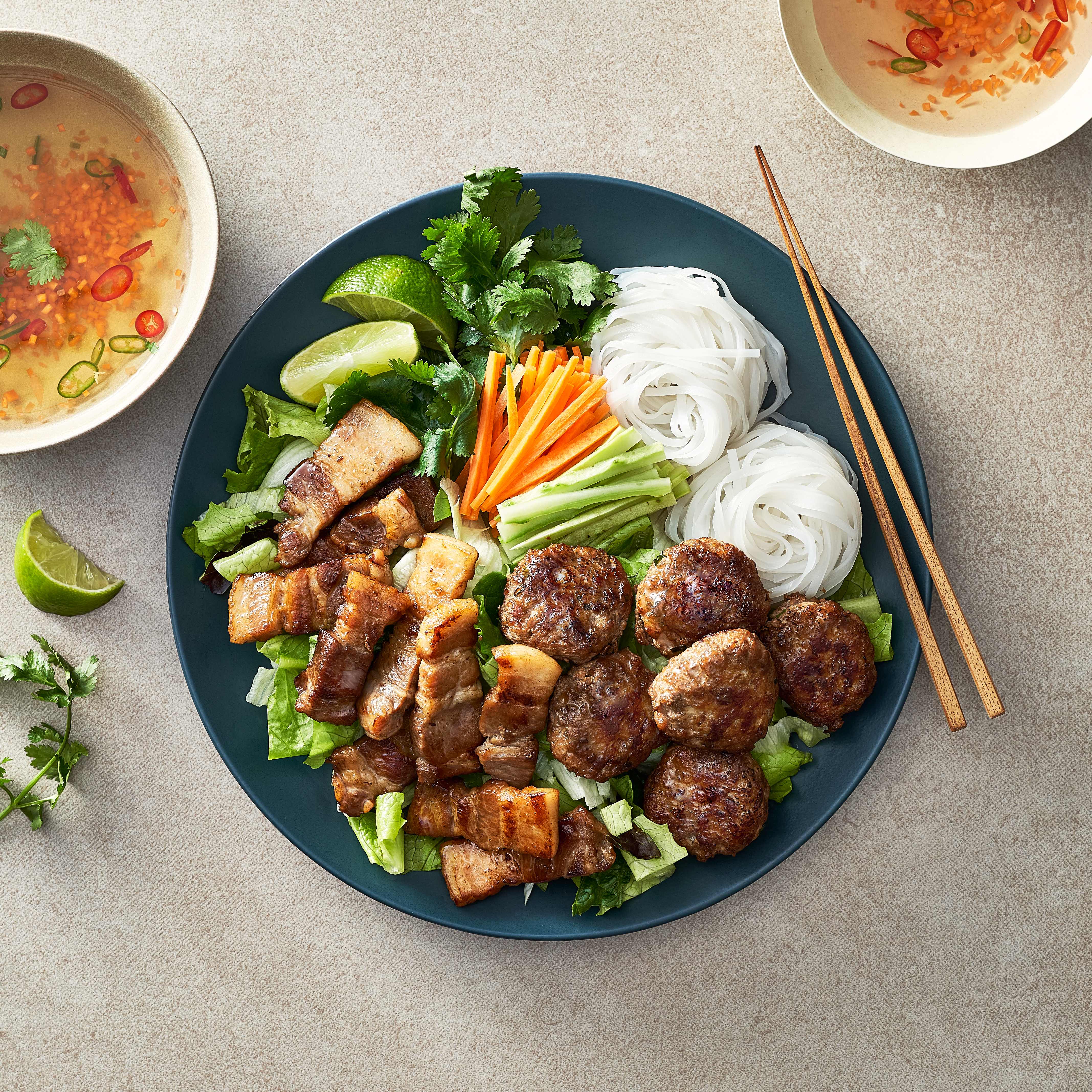 4. 그릇에 모든 재료를 담고 달콤 짭조름한 분짜 소스를 곁들이면 완성. 기호에 따라 향긋한 고수와 상큼한 라임을 더하면 이국적인 풍미가 더욱 살아난다.